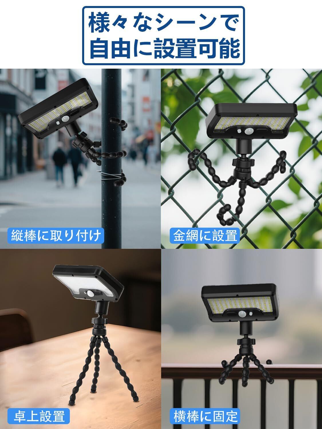 【頑丈な三脚設計・360°回転】このソーラーセンサーライトは革新的な三脚設計を採用しており、必要に応じて木、フェンス、立て柱、鉄線網などの場所に固定できます。その三脚は非常に頑丈で力強く、横向きでも縦向きでもライトをしっかりと固定できます。したがって、配線やその他の設置ツールが不要で、設置が非常に柔軟です。必要な場所にライトを固定し、必要に応じてライトの照射角度を調整できます。センサーライトは庭、玄関、通路などの場所で使用するのに非常に適しており、また屋外キャンプ時に照明や雰囲気を調整する良い助けとなります。