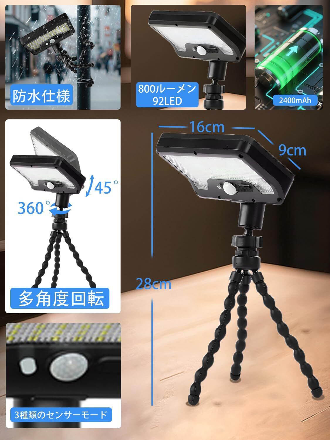 【数量限定】2025最新 ソーラーライト 屋外 センサーライト 屋外 ソーラー 人感 人感センサー 防犯 800ルーメン超高輝度 2400mAh大容量 92LED フレキシブル三脚付 360度調整ランプ 充電式 USB充電可 IP65防水 昼白色 玄関 駐車場 ガーデン 柵 キャンプ用 地震 停電 津波 台風 防災対応 (2個)