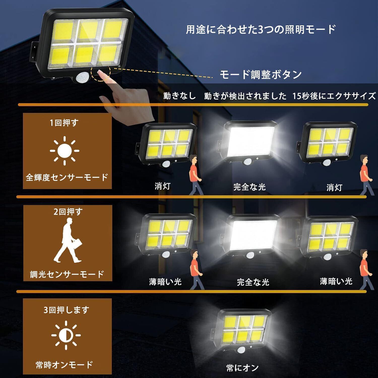 ■ 点灯方式:3つのモード(常時点灯、人感センサー、自動点灯)