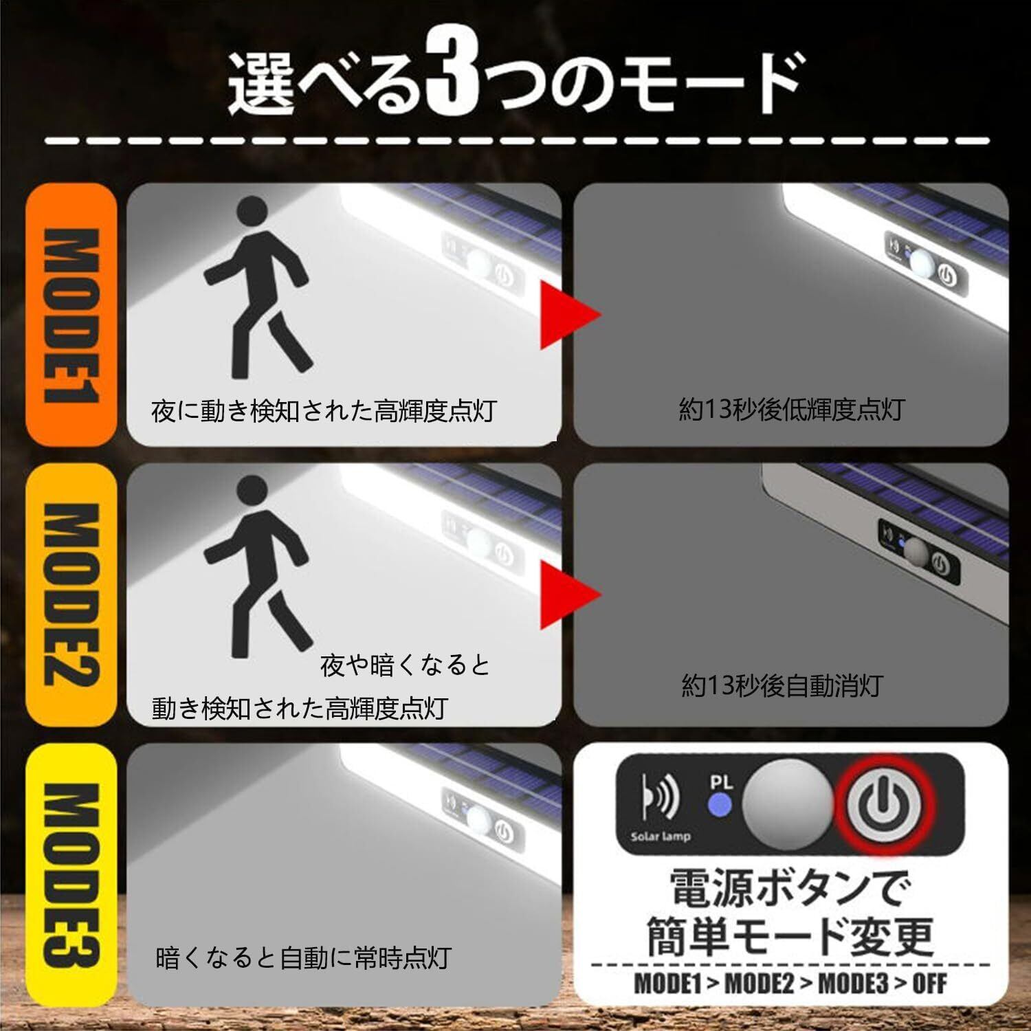 【3つの点灯モード】この人感センサーソーラーライトは(DIMモード+高輝度センサーモード+常時ライトモード)3つの知能点灯モードが搭載されます。スイッチを一回目押して「DIMモード」:暗くに動き検知された高輝度点灯、約13秒後低輝度点灯します。二回目スイッチをおして「高輝度センサーモード」:暗くなると、動き検知された高輝度点灯、約13秒後自動消灯します。三回目スイッチを押して「常時点灯モード」:周囲が暗くなると常夜灯として弱発光。