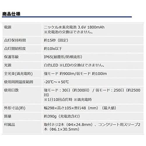 電源:ニッケル水素充電池 3.6V 1800mAh 点灯保持時間:約15秒(固定) 点灯開始照度:約10lx以下 保護等級:IP65(耐塵形/防噴流形) 光源:白色LED 全光束(満充電時):強モード 約900lm/弱モード 約100lm 使用周囲温度範囲:-20℃~+50℃