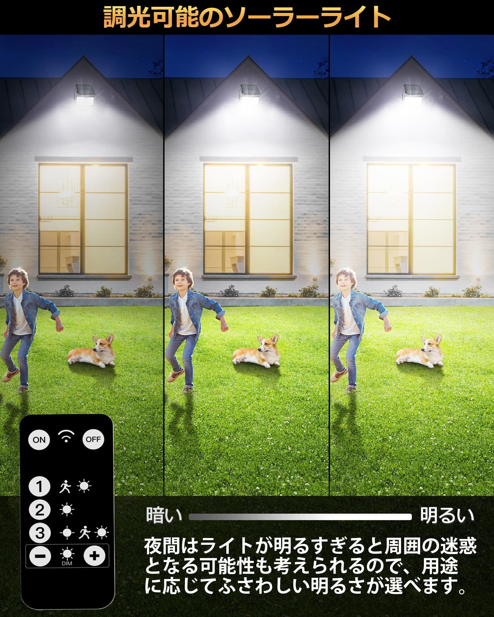 【新世代センサーライト・明るさ調節】本製品は、今までの常識を覆し、明るさ調節可能、四面に同時照射可能、より高輝度照明を継続していただくために開発された、最新世代のソーラーライトです。リモコンのボタンを押すだけで明るさが三段階調整可能で、利便性が高いです。弊店の最新版だけでなく、市場ではLEDソーラーライトシリーズで機能と性能が最新分離型ledセンサーライトです。