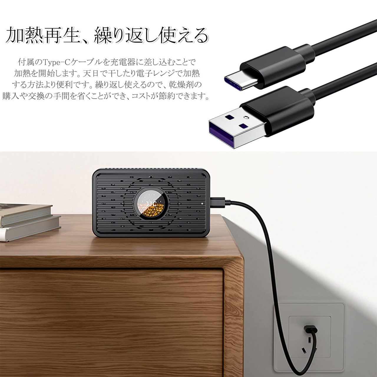 【加熱再生、繰り返し使える】充電式であるため、加熱再生できます。付属のType-Cケーブルを充電器に差し込むことで加熱を開始します。天日で干したり電子レンジで加熱する方法より便利です。繰り返し使えるので、乾燥剤の購入や交換の手間を省くことができ、コストが節約できます。