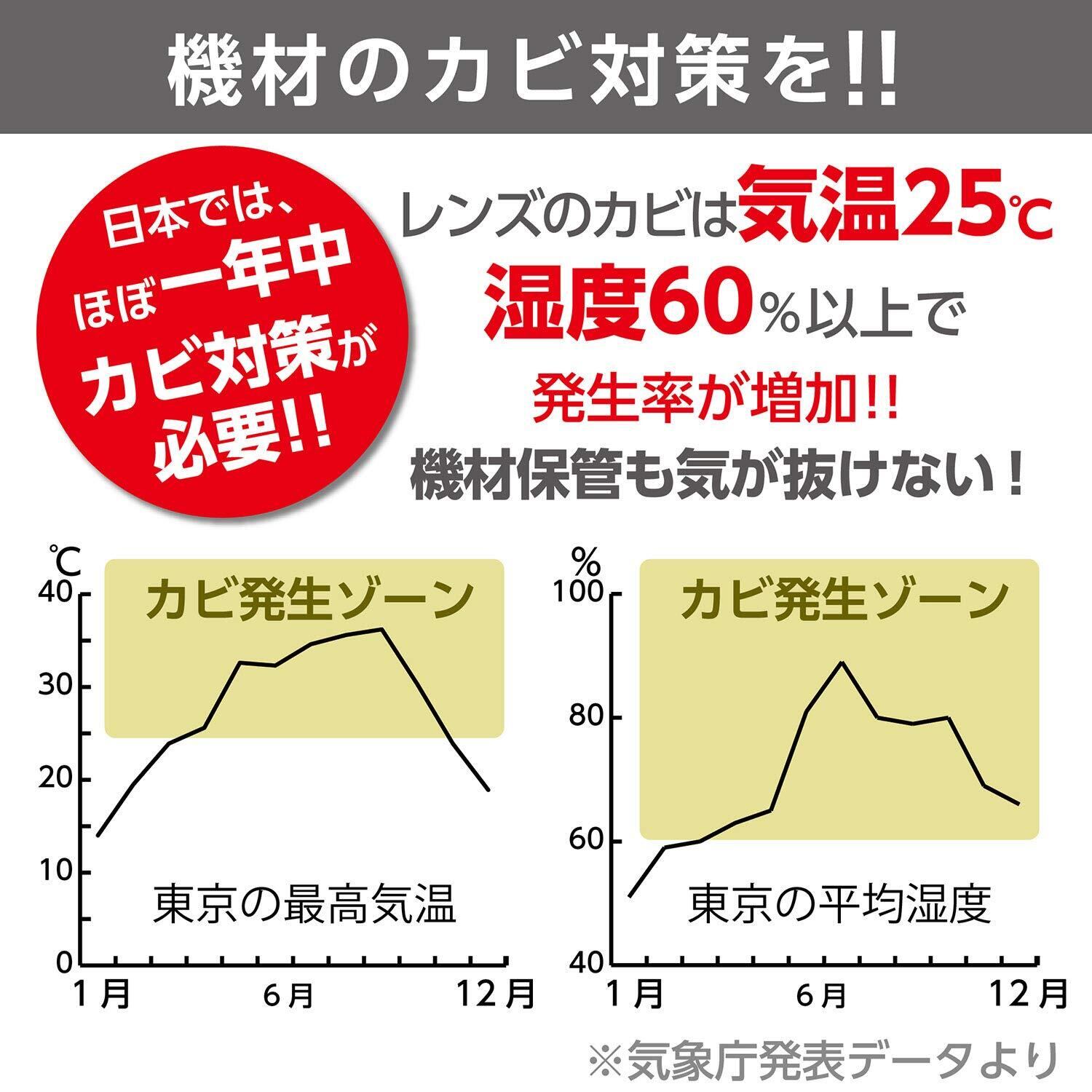●シリカゲルのはたらきにより、湿度を調節しカビの発生をおさえます。●また、脱臭効果もあります。●吸湿して効果が低下しても、乾燥させることで回復し、何度でも使えます。●広い容積の吸湿が可能な大容量タイプです。●密閉容器に本品だけをいれていったん湿度を下げてから、カメラなどを入れてご使用ください。●湿度の高い状態が長く続いたときに吸湿効果が低下することがあります。●再生サインがブルーからピンクに変わったら、効果的にお使いいただくために天日に3~4時間干して下さい。吸湿効果が回復します。●レンジ・ストーブなどの直火乾燥は危険ですのでおやめください。●別売の防カビ剤『レンズフレンズ』を併用すればより一層のカビ対策ができます。
