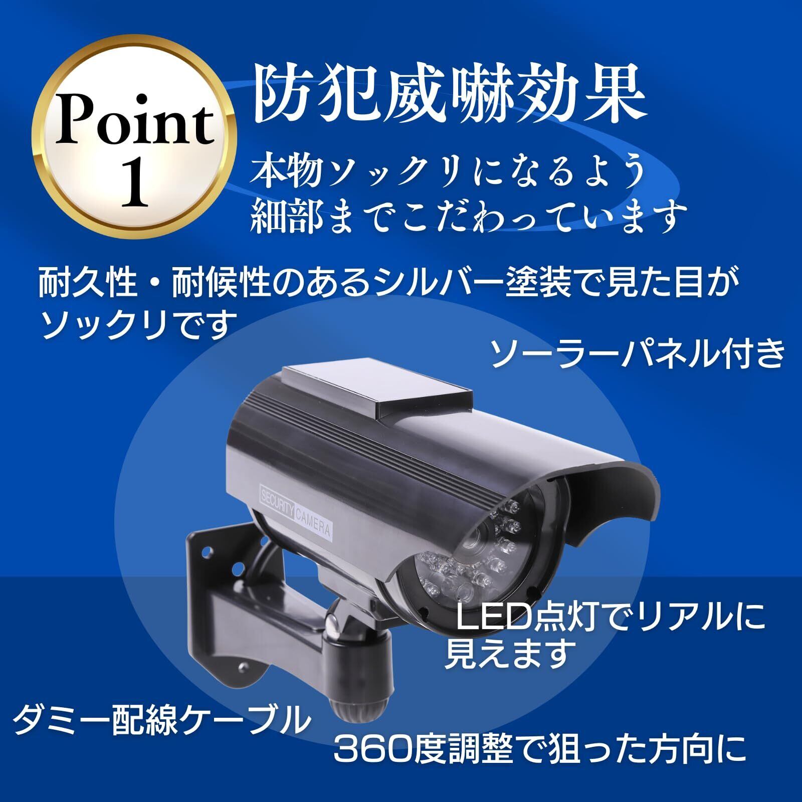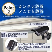 【 本物の防犯を参考に考案】 防犯カメラを設置することで犯罪者を威嚇することができます。 程よい赤色LEDライトでリアル感を演出 【ダミーケーブル】ケーブルが遠くから見ると配線のように見えるので犯罪抑止力になります 【 ソーラーパネル】熱くならないLED発光なのでエコで安全です 電池を入れるとさらに夜間も点灯しますが、点灯なしでも十分に威嚇することは可能です。※電池は同梱しません 【防水】生活防水あり。軒下防滴機能あり。
