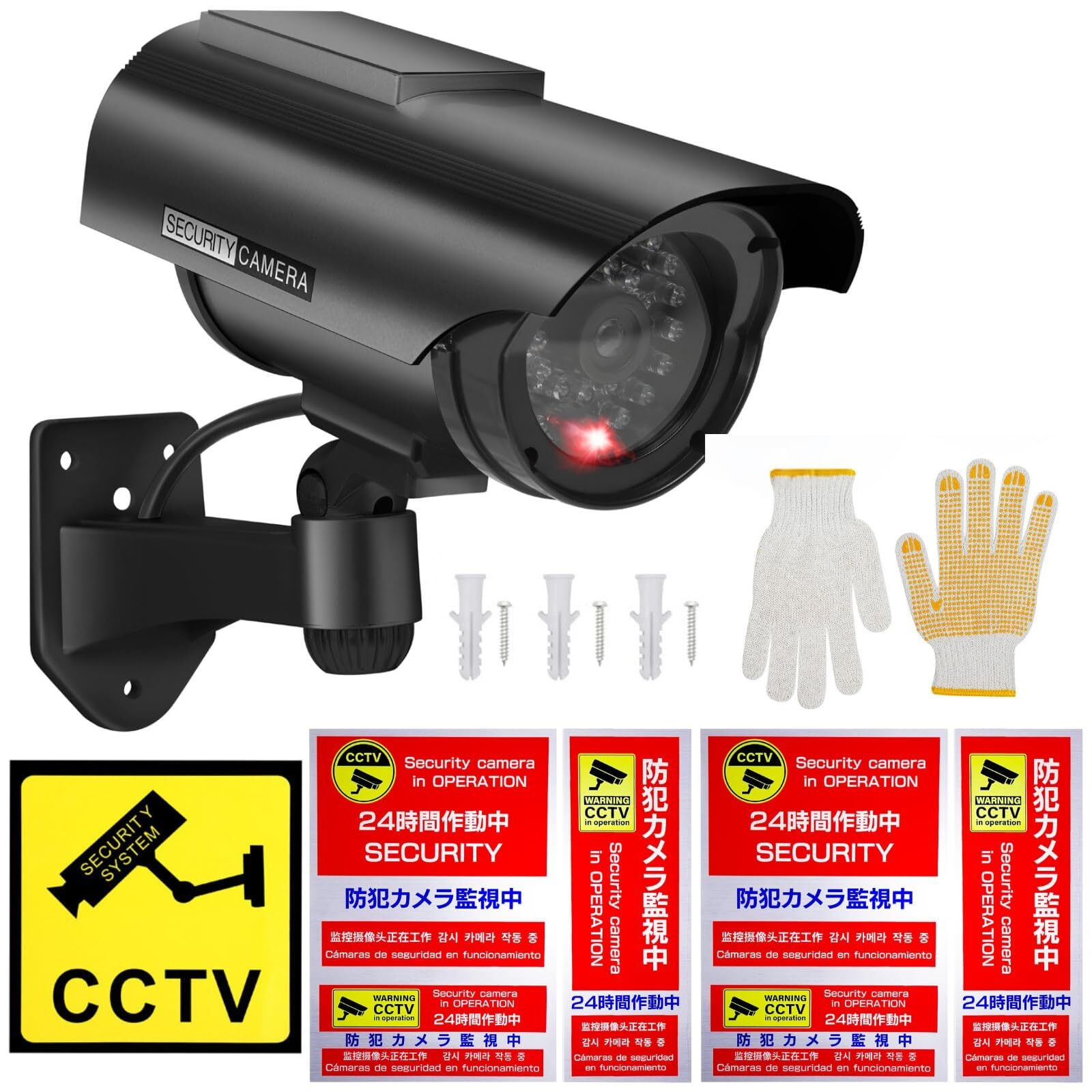 【セット内容】 : ◉ダミー防犯カメラ、ネジ、コンクリートプラグ3本 ◉取付金具セット ◉防犯ステッカー 2セット(3枚が1セット組 21×20cm)、黄色防犯カメラステッカー1枚 合計7枚 ◉軍手 ◉取扱説明書