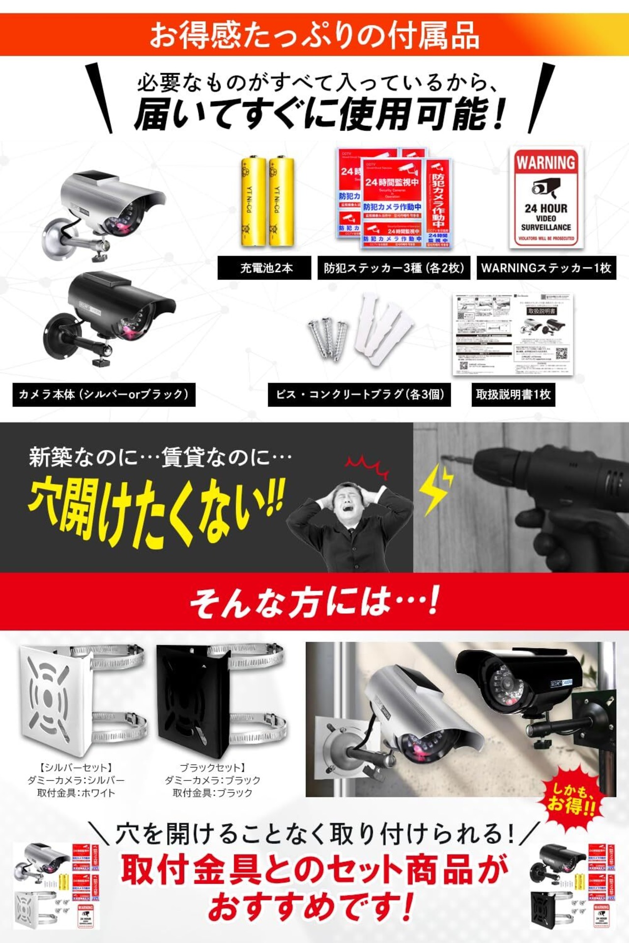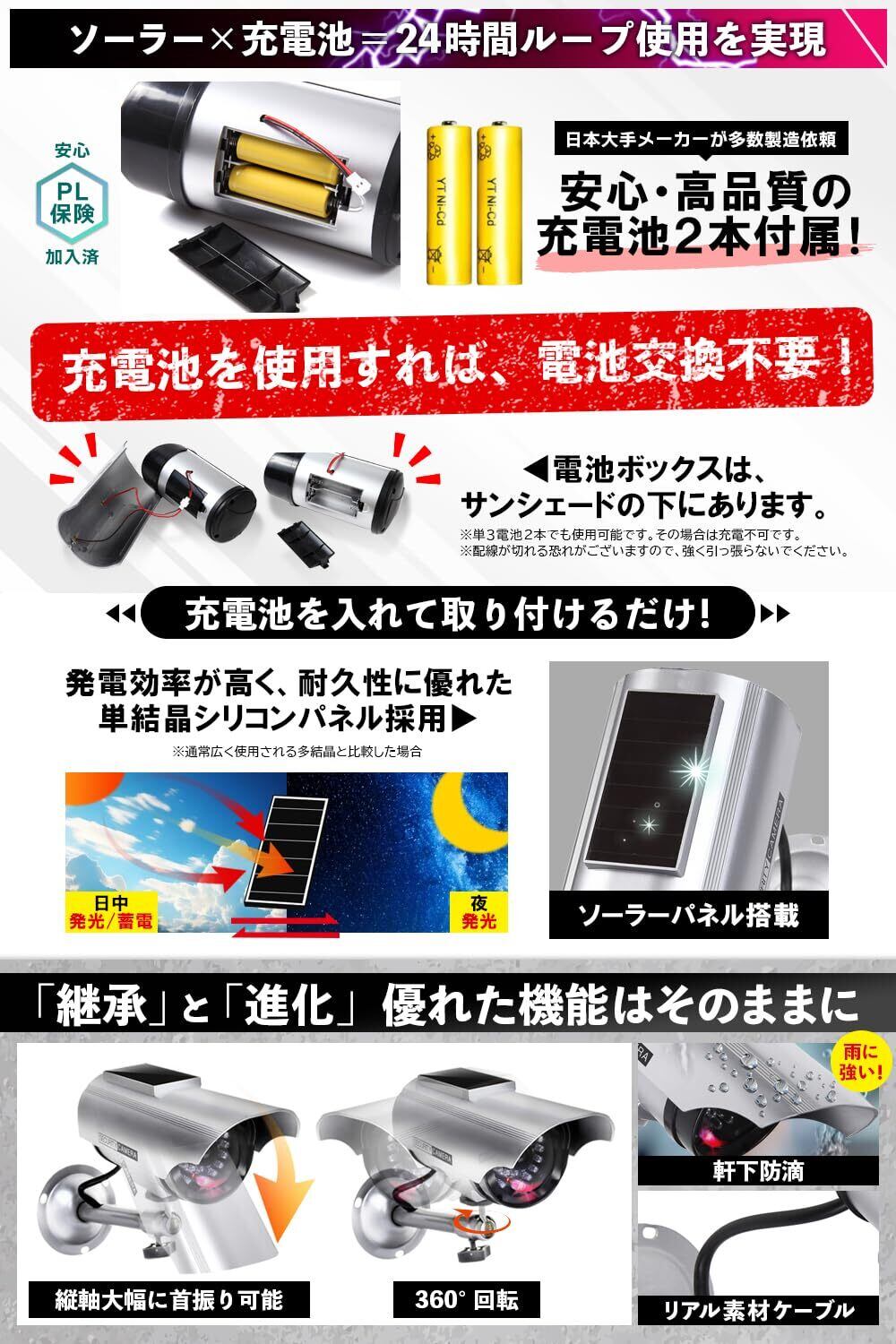 【付属充電池について】付属の「充電電池」は日本大手メーカーも発注している信頼できる老舗工場から仕入れを行っております。勿論事故は1度も発生しておりません。安心してご選択下さいませ。 【 ダミーカメラ ご注意点】蓄電・発光には十分な「直射日光照射(室内灯は不可)(特に充電池装着直後)」が必要です。また、日光が当たらない場所でご使用いただく場合 ・電池を抜き取りソーラーのみでご使用(弱い日光でも点灯可)(日中のみ) または ・乾電池(別売)のご使用をお願いいたします。 .