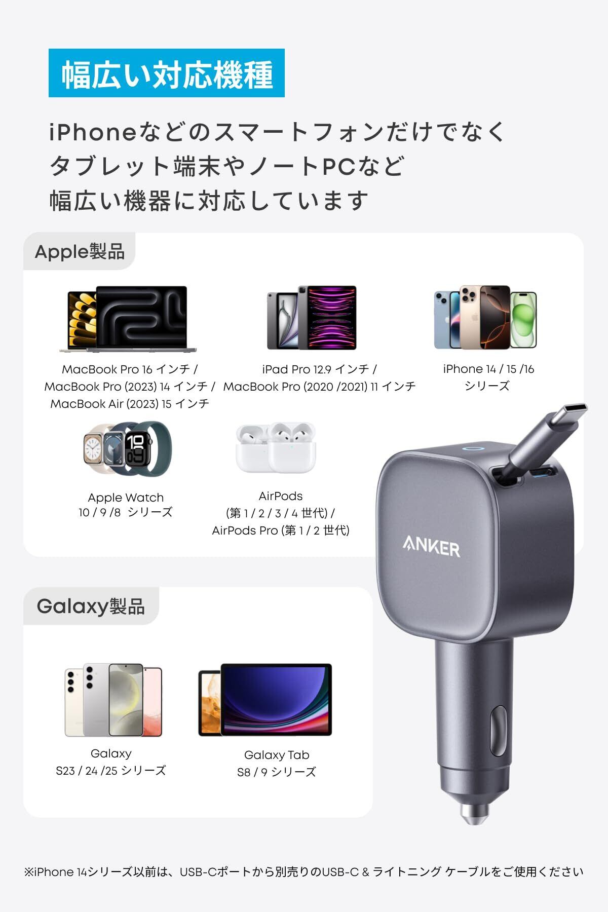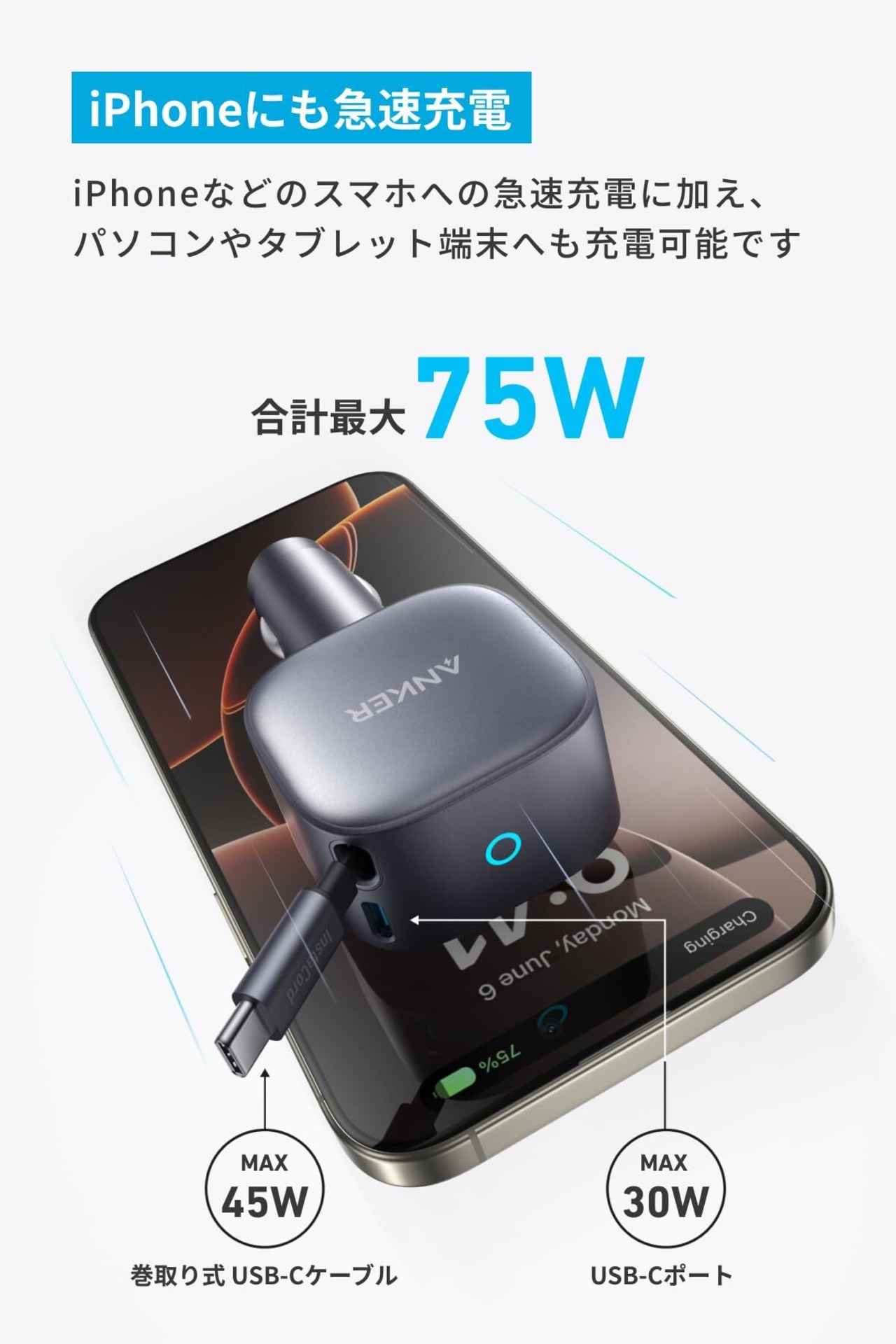 Anker Nano Car Charger (75W, 巻取り式 USB-Cケーブル) iPhone Galaxy Android スマートフォン ノートPC iPad 各種 その他機器対応