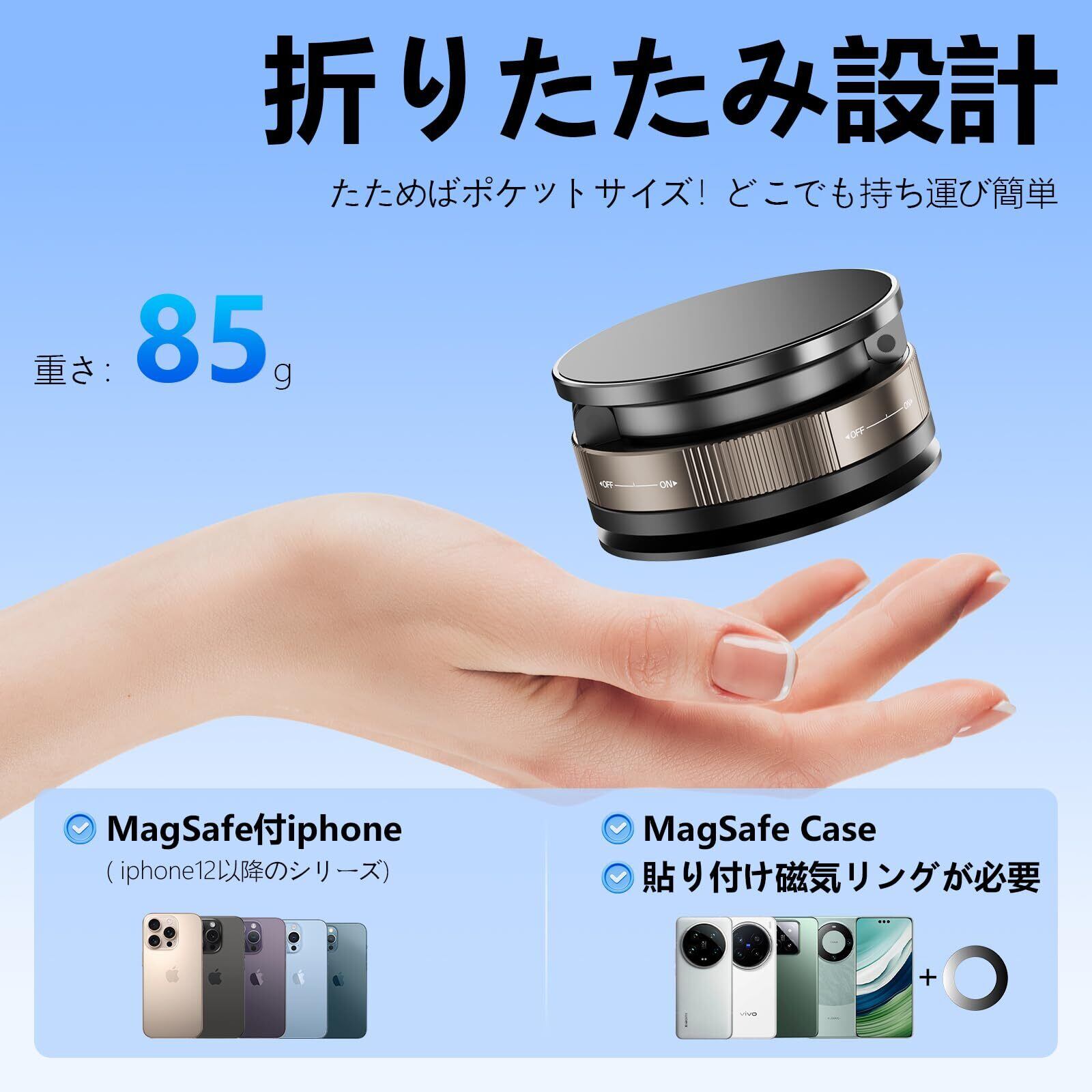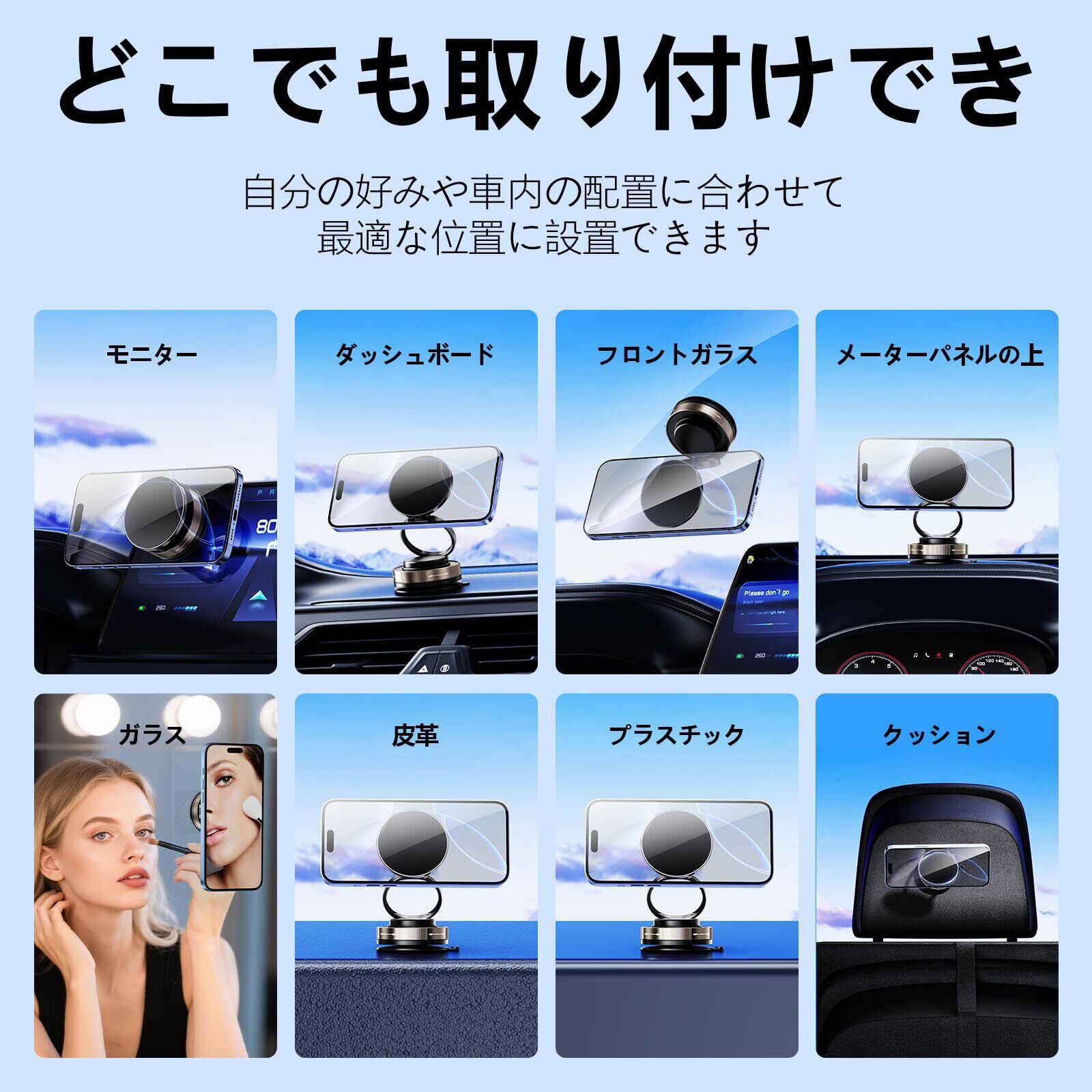 【幅広い互換性】幅広い互換性であらゆるユーザーへ。 iPhone 12/13/14/15/16シリーズはもちろん、Galaxy、Xperia、PixelなどAndroid機種も使用可能。軽自動車からSUV、トラックまで幅広く設置対応。厚めのケースでもしっかり吸着します。あらゆる車種やスマホサイズに対応し、安心して使用することができます。