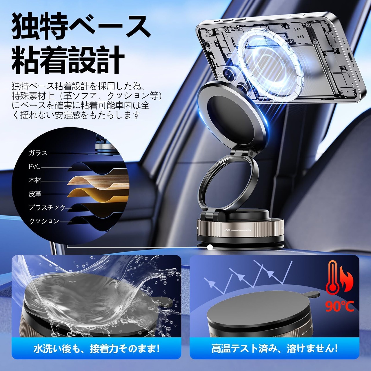 ■【二重固定で安心のホールド力!】最新設計の真空吸盤と超強磁力のW固定構造によって、どんな道でもスマホをしっかりとホールド。揺れや振動に強く、大切なスマホを守ります。