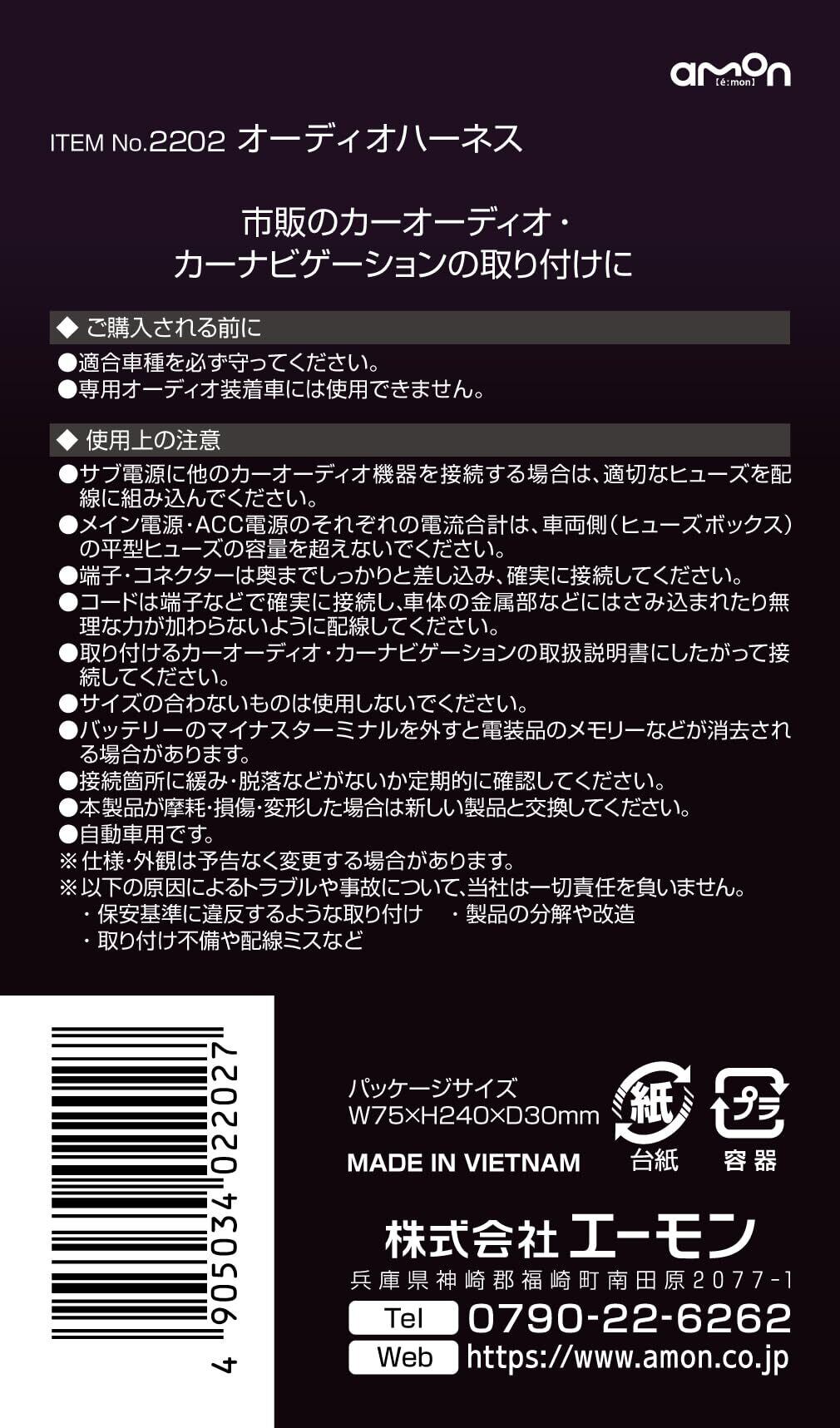 このエーモン オーディオハーネスを使用して、カーナビゲーションやオーディオデッキの取り付けを手軽に実現し、快適なドライブを楽しんでください!車内のオーディオ環境を向上させるための必需品です。