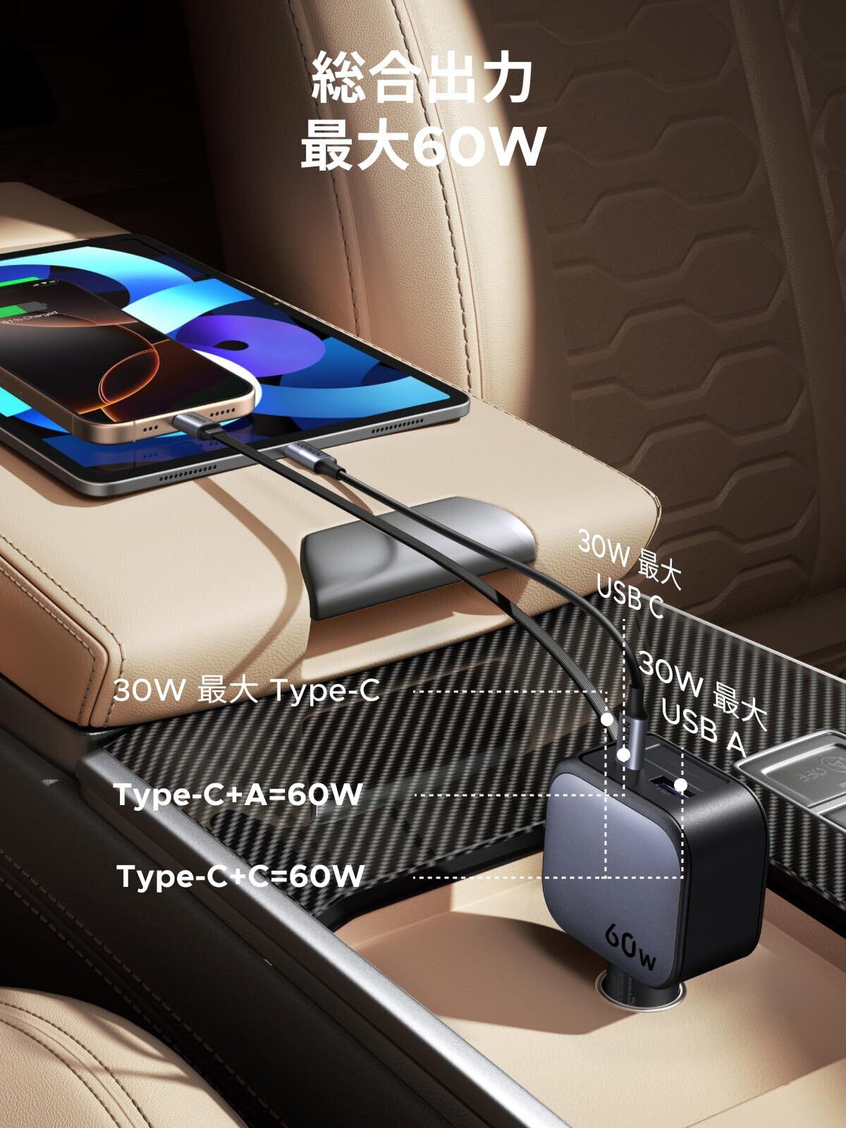 UGREEN 【70cm巻き取り式】3ポート 合計60W シガーソケット 上部コード磁力収納可能 片手で 長さ・角度調整可能 「運転用 車の便利グッズ 収納 」 PD・PPS対応 スマホ・タブレットなどType-C適合 iphone17シリーズ