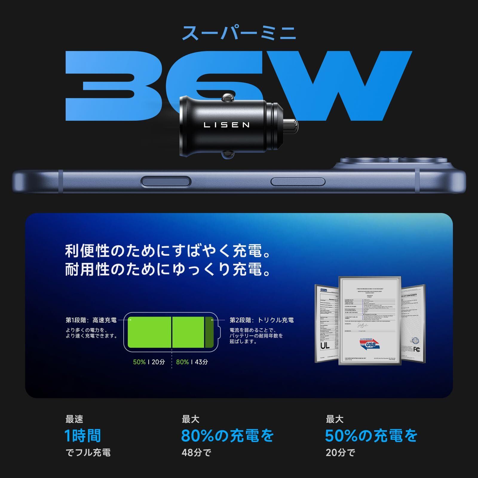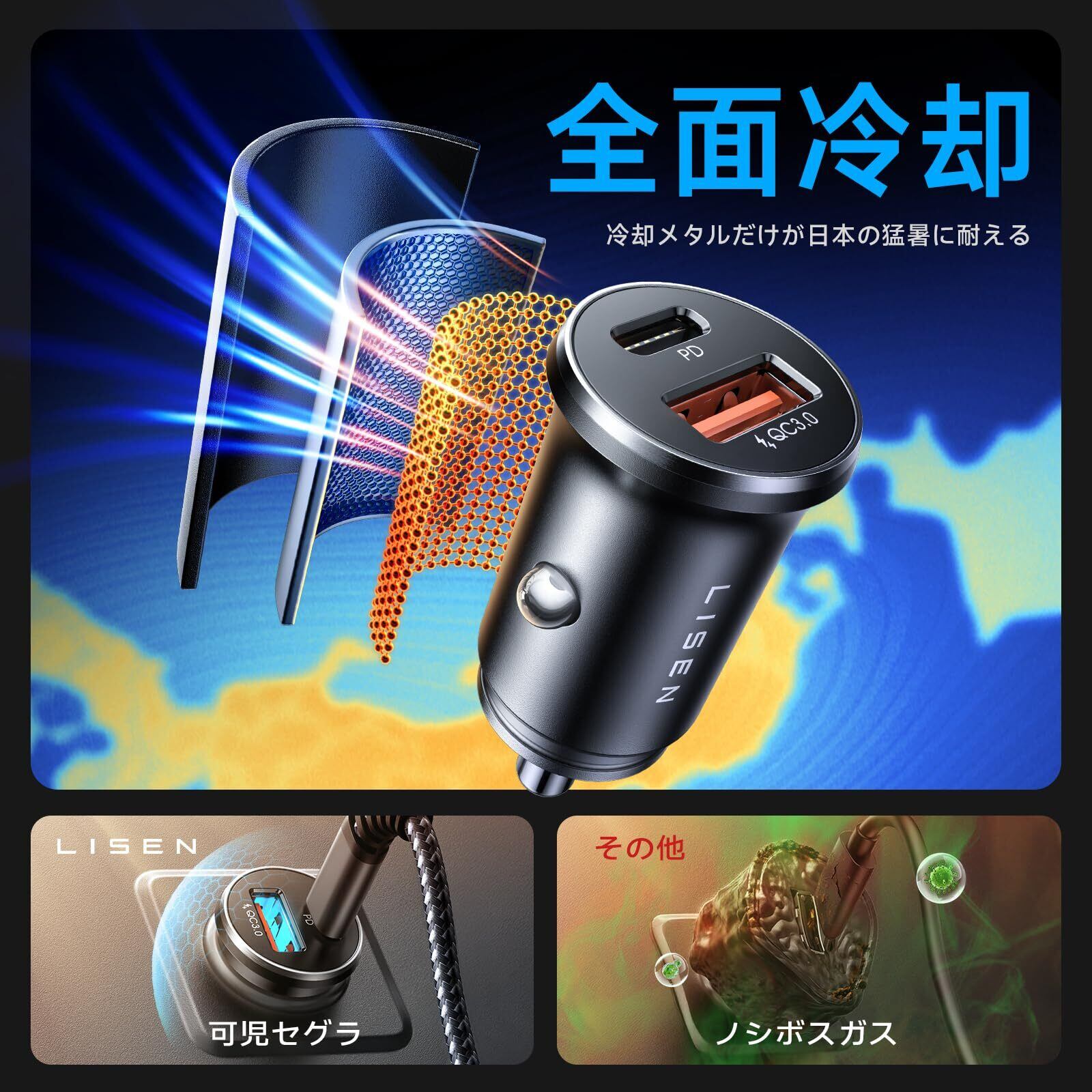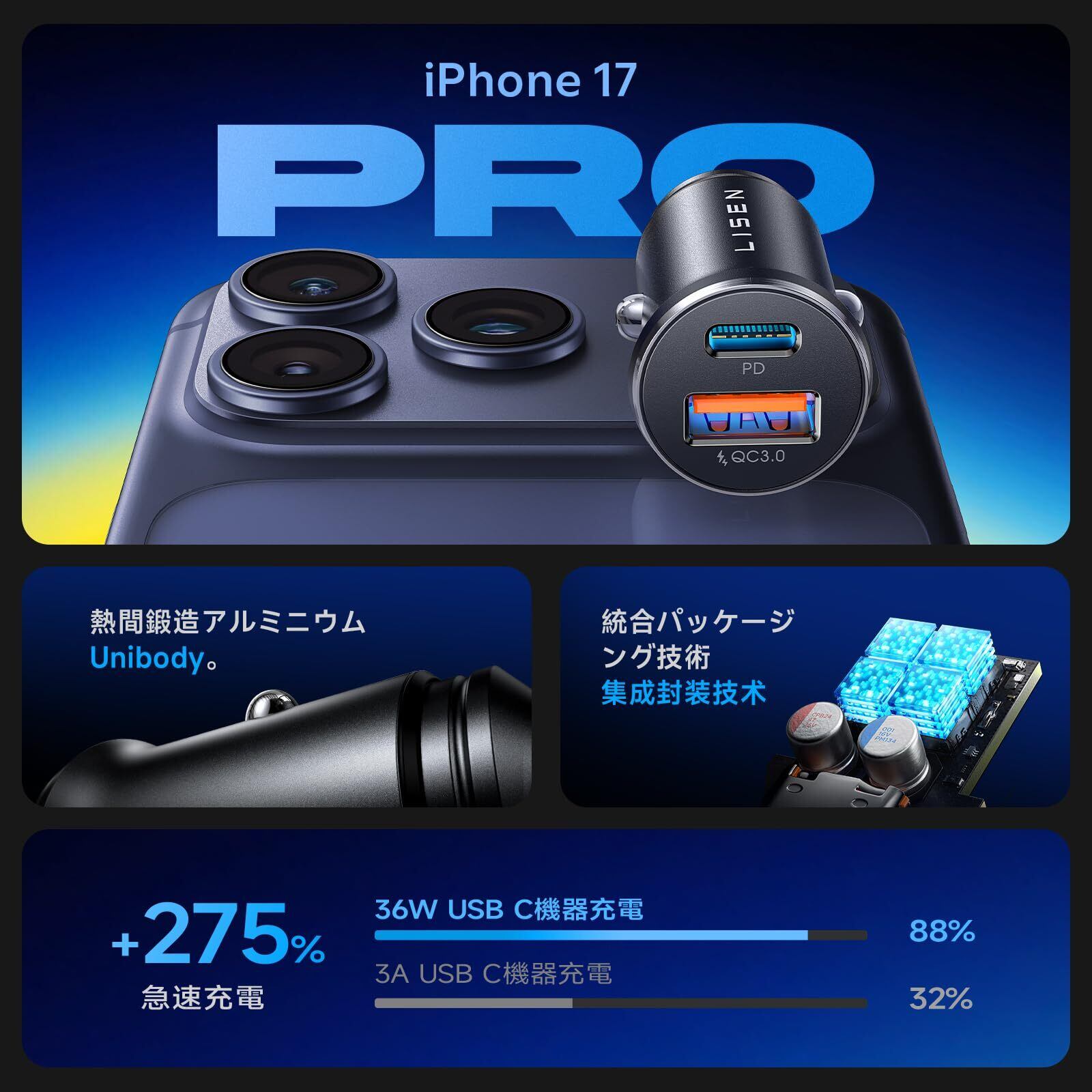 【数量限定】LISEN しがーソケット USB Cタイプ 【業界最小・超高速充電】シガーソケット USB-C 急速充電 PD36W + QC18W 金属ボディ 2台同時充電 12V/24V対応 30分で50%充電 タイプC USB-A デュアルポート iPhone 17 Pro Max / 16 / 15 / 14 / 13 / Air/e シリーズ Xiaomi Pixel iPad 対応 深空黒