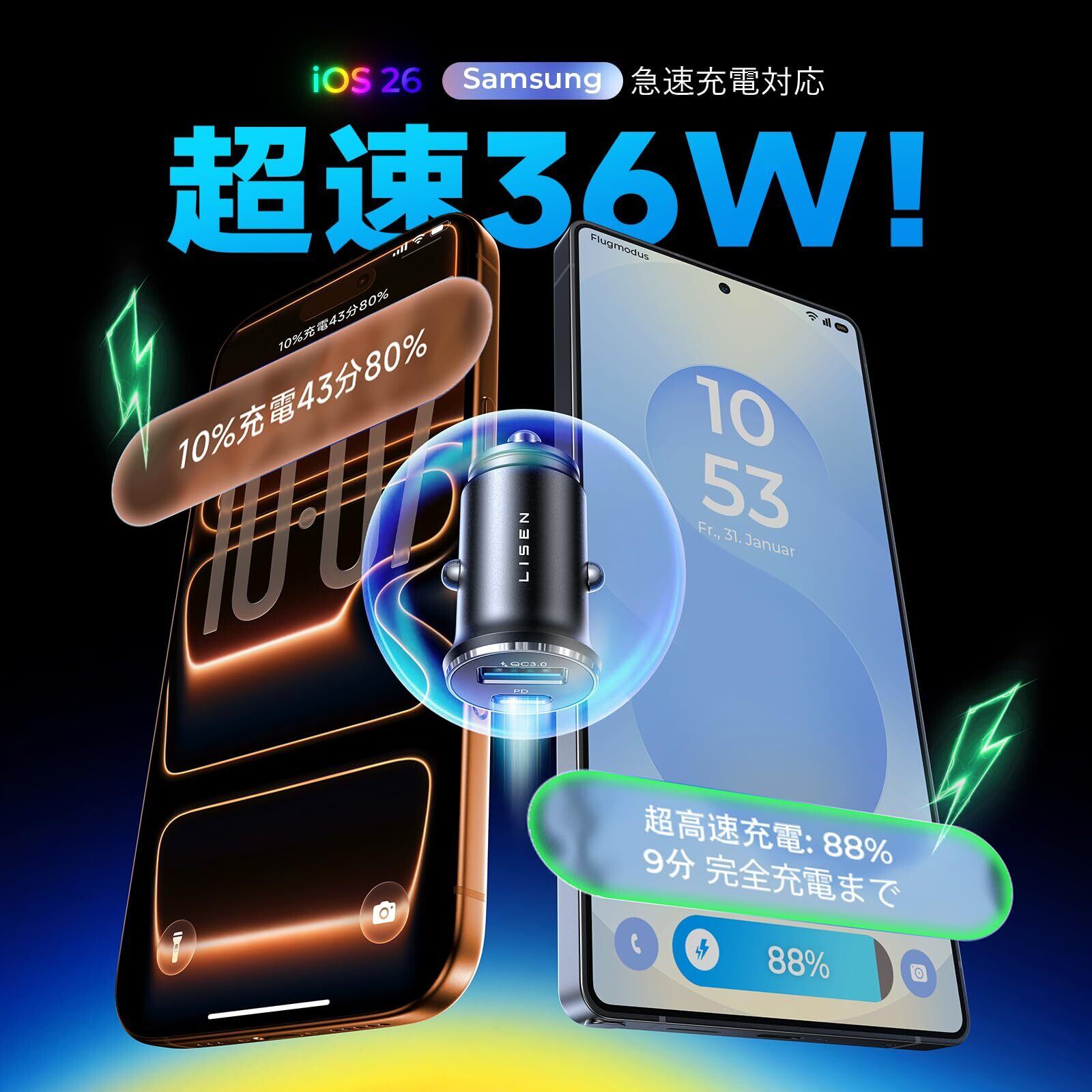 【数量限定】LISEN しがーソケット USB Cタイプ 【業界最小・超高速充電】シガーソケット usb-c 急速充電 PD36W + QC18W 金属ボディ 2台同時充電 12V/24V対応 30分で50%充電 タイプC USB-A デュアルポート iPhone 17 Pro Max / 16 / 15 / 14 / 13 / Air/e シリーズ Xiaomi Pixel iPad 対応 深空黒