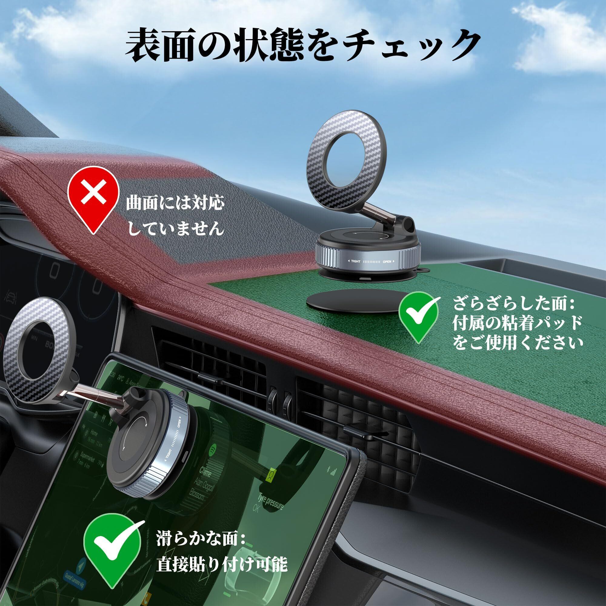 【重要:対応表面について】この真空吸盤式車載スマホホルダーは、フロントガラス、センタースクリーン、光沢のあるダッシュボードなど、滑らかな表面に最適です。ざらついた表面やダッシュボードには、付属の粘着パッドをご使用ください。(ご注意:曲面、凹凸のある表面、不規則なレザー素材には対応しておりません。鏡、ガラス、電子スクリーン、ホワイトボード、滑らかな金属、大理石など、すべての滑らかな表面に対応しています。)