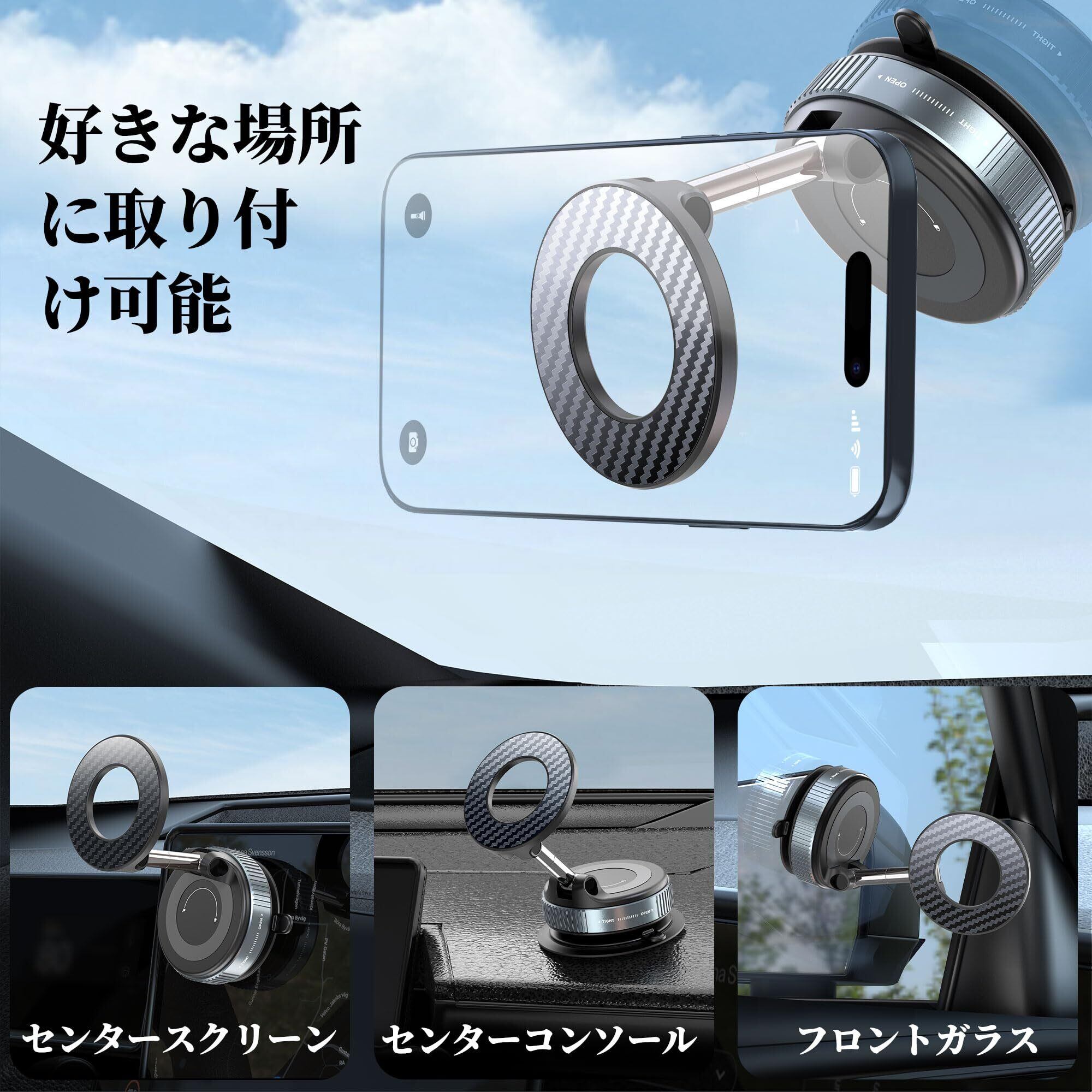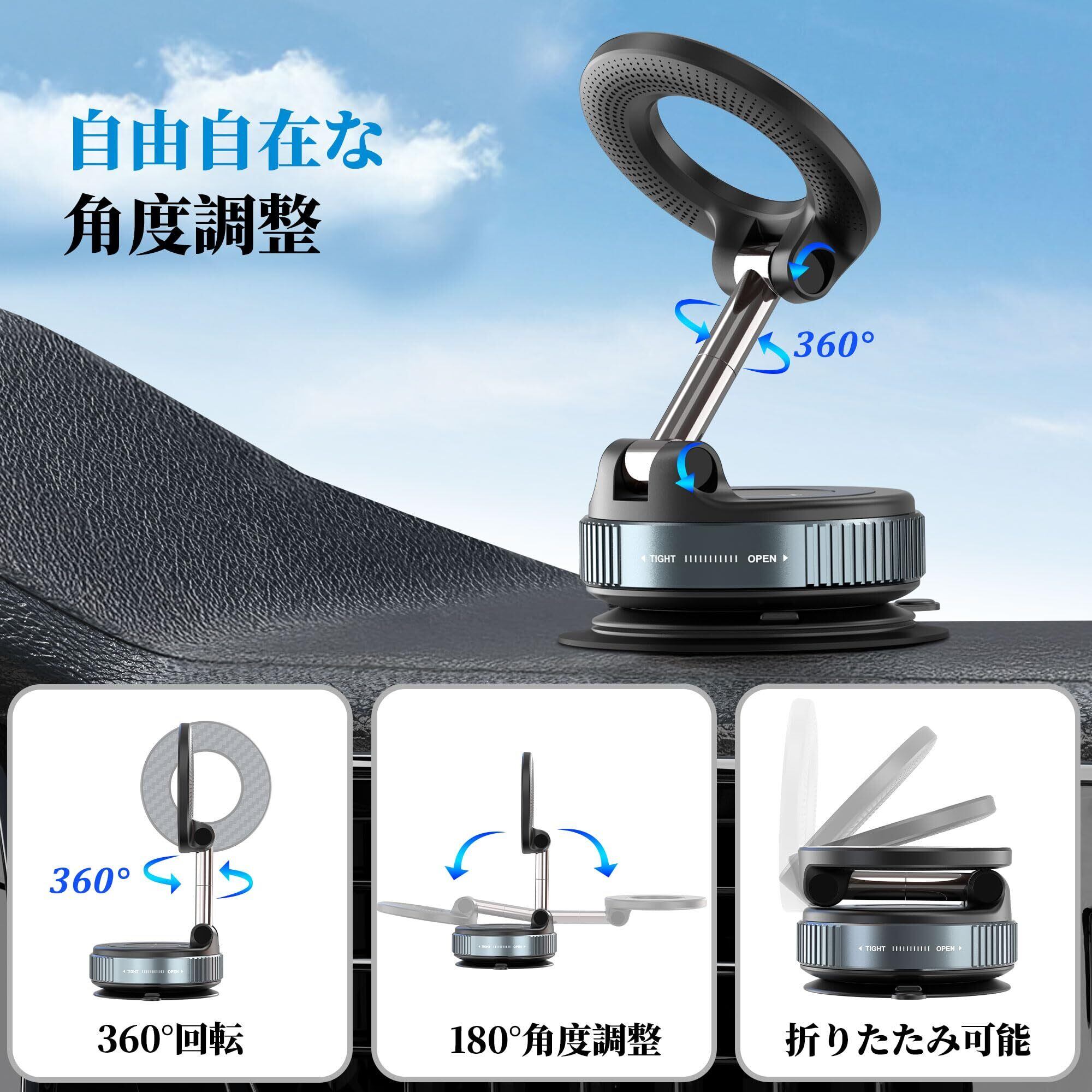 PlusAcc スマホホルダー 車 車載スマホホルダー 真空吸盤 & 強力マグネット 多角度自由調節 360°回転 折りたたみ式真空吸着式スマホホルダー Mag-safe車載ホルダー 超強力N55磁石搭載 iPhone 16/15/14/13/12シリーズとAndroid多機種と多車種に対応マグセーフ車載スマホスタンド 車用品 高級アルミ合金製 安定感 簡単着脱 便利な車載携帯ホルダー