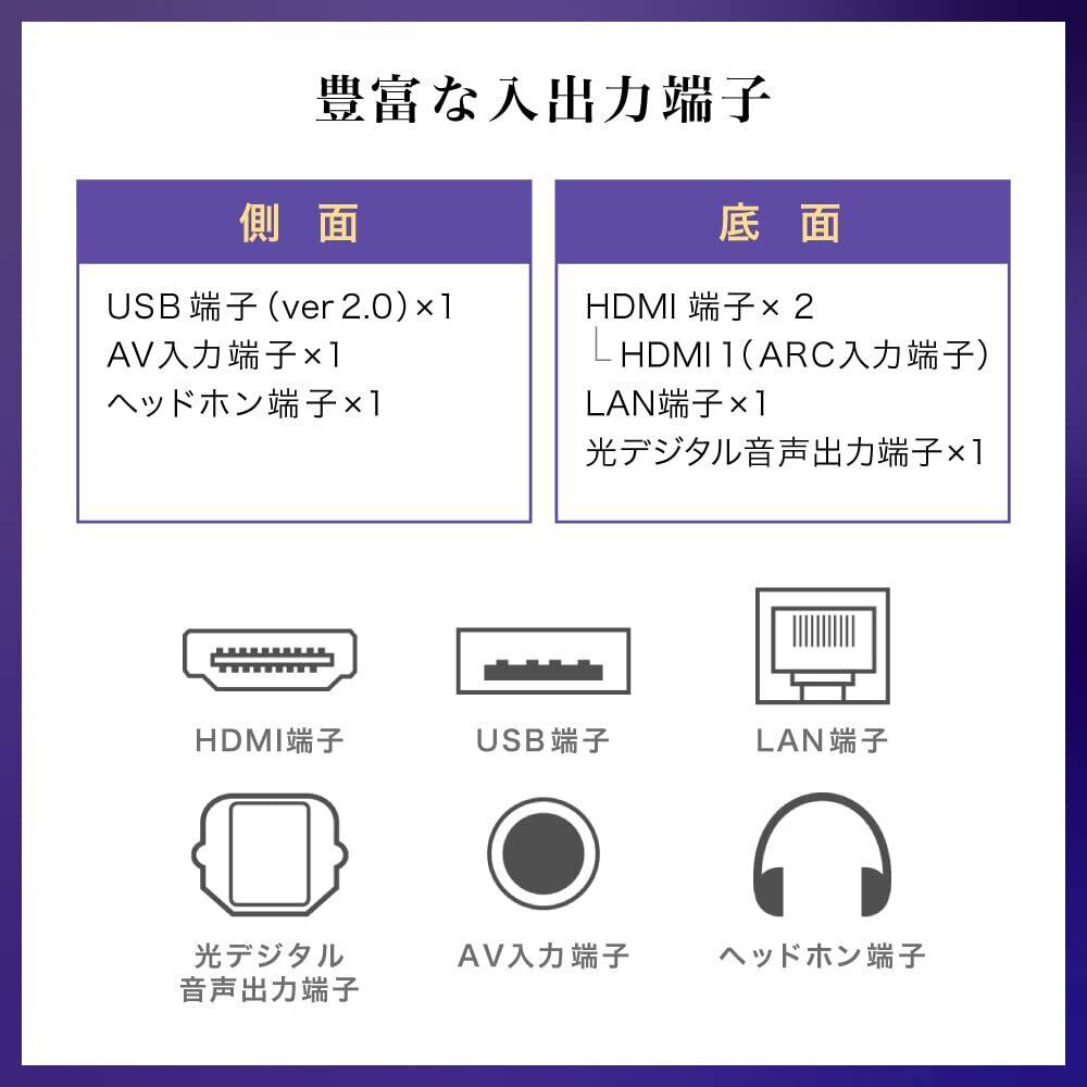 このチューナーレステレビで、自宅でのエンターテインメントをもっと充実させましょう!家族や友人と一緒に、素晴らしい視聴体験をお楽しみください。