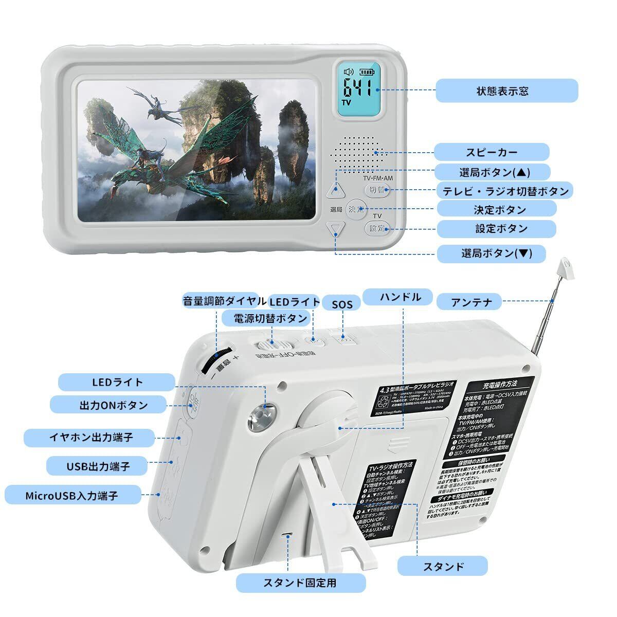 ワンセグテレビ 4.3inch液晶パネル搭載 ポータブルテレビ FM/AMラジオ付き 手回し発電可能 3WAY電源 LEDライト・SOSサイレン付き 防塵カバー付き イヤホン接続可能