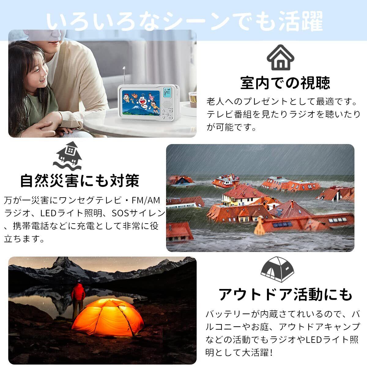■【SOSサイレン・LEDライト】SOSサイレンとLEDライト付きで、非常時にボタンを押す事により、LEDライトと、大音量のサイレン音がなります。SOSアラームにより、災害時などには自分の居場所を伝える事に役立ちます。ライト機能(懐中電灯)付きのラジオは災害時に重宝します。防災ラジオは懐中電灯と読書ライトを搭載します。災害時は電気が止まった状況での避難でも安心です。それに、夜に災害が起こった場合、足元さえも見ない可能性もありますので、懐中電灯が必要になるでしょう。また、災害時だけでなく登山やキャンプなどのアウトドアの際にも、懐中電灯は活躍してくれます。以前の機種と比べると、この携帯テレビはSOSボタンとLEDボタンを単独設置し、簡単で操作可能です。