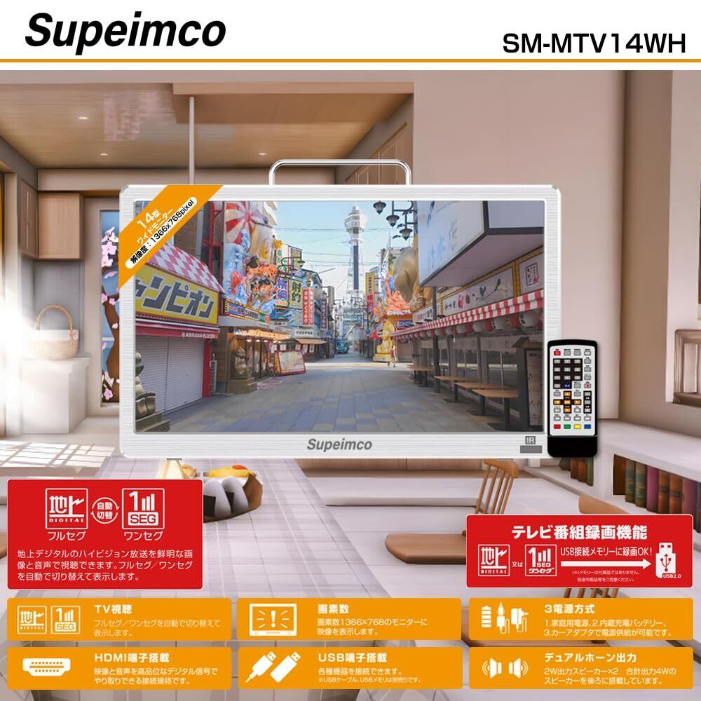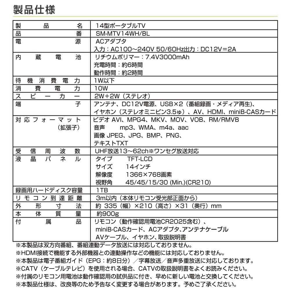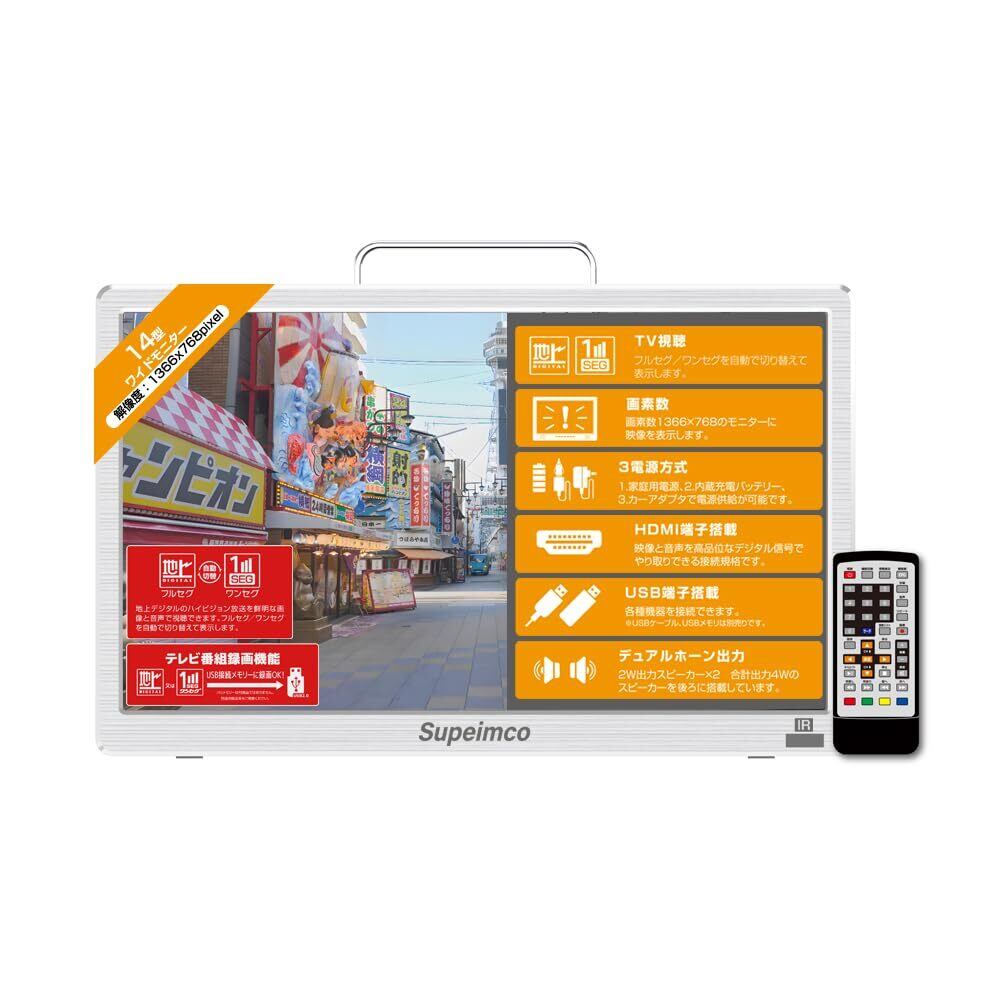 14インチポータブルテレビ, HDMI端子搭載で、ゲーム機やパソコンなどのデジタル機器との接続も可能。USBポートを2基装備し、外部メディアの再生にも対応、お気に入りの番組を録画して持ち運べます,モバイルバッテリーに AC電源・車載電源に対応 スタンド/吊り下げ/車載3WAY設置,リモコン付き 遠距離制御