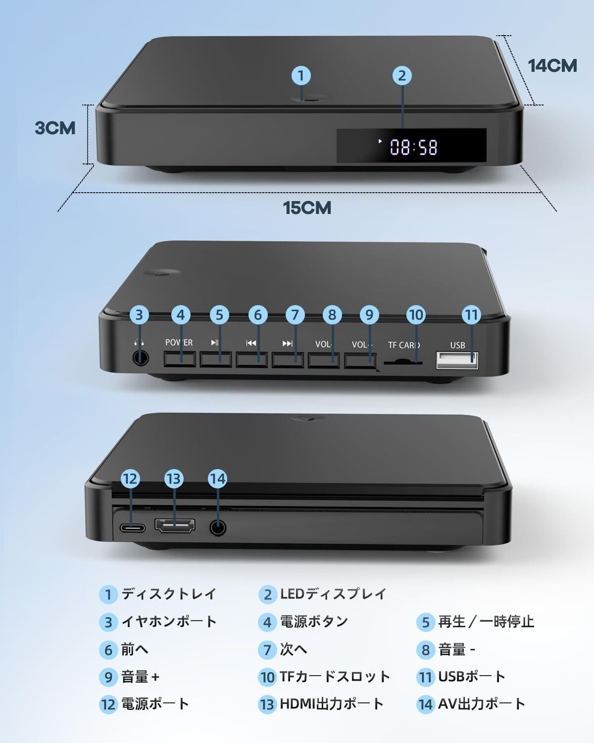 【ミニDVDプレーヤー&イヤホン端子付き&小型で携帯しやすい】 この機器は、CDプレーヤーまたはDVDプレーヤーとして使用可能です。わずか280gの軽量で、幅15cm、高さ3cm、奥行き14cmという小型サイズを誇ります。本体にはイヤホン端子が搭載されており、外出先でも高品質な音楽を楽しむことができます。さらに、モバイルバッテリーを使用して給電しながら、CDを再生することも可能です。その軽量かつコンパクトな設計から、携帯性にも優れています。(ご注意:本機には喇叭が搭載されていないため、イヤホンや外部スピーカーを使用して音楽をお楽しみください。)