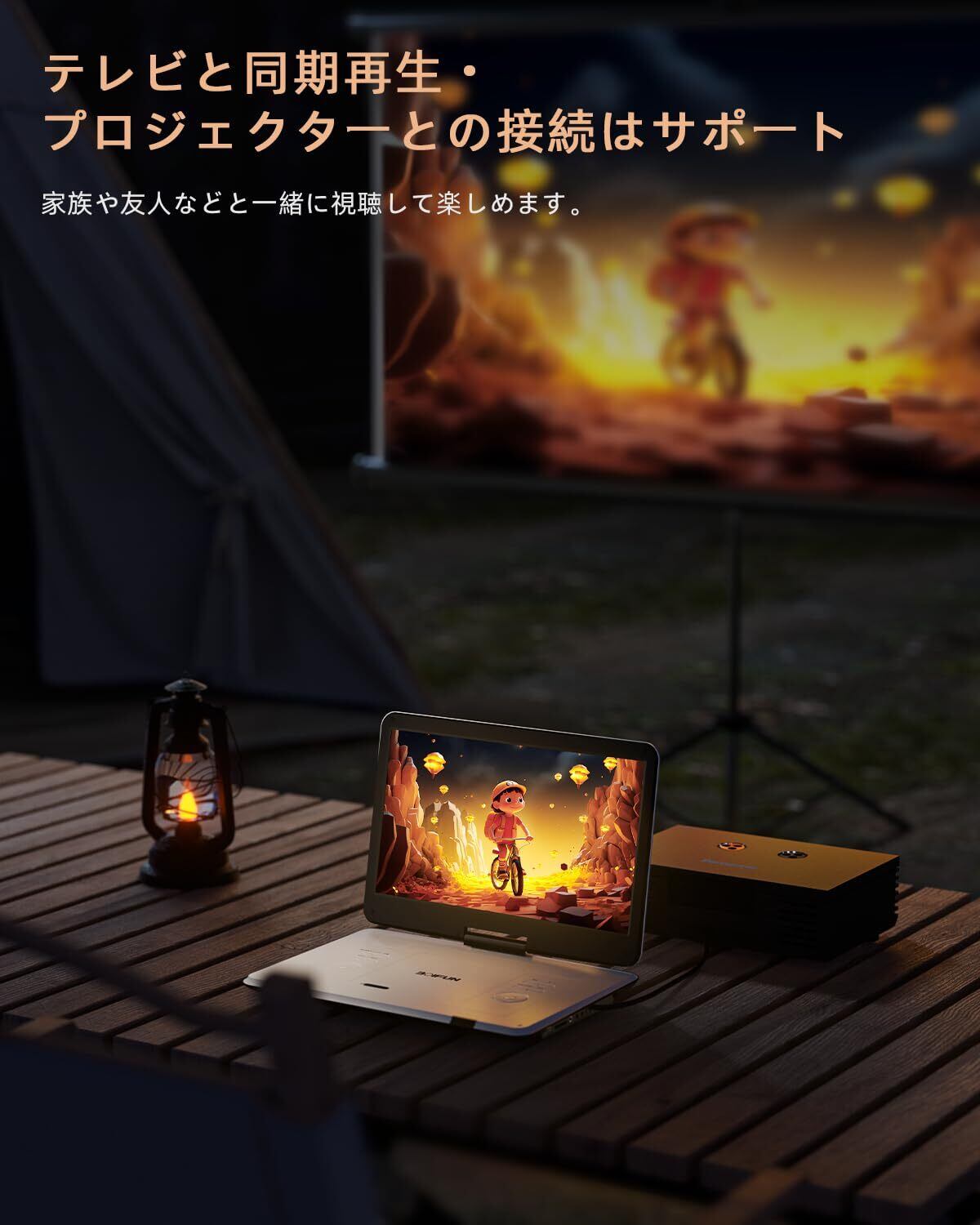 【テレビと同期&優れた高音質&多彩なファイル形式に対応&イヤホンでサポート】SDカードやUSBメモリーに保存されたファイルも再生可能。(最高32GB) AV入出力がありのでテレビに接続して、大画面で映画視聴をすることも可能です。高品質のダブルスピーカを搭載し、優れた高音質を実現しております。一流視聴体験のDVDを楽しめましょう。3.5mmイヤホンジャック対応で、病院や車内など静寂が必要な環境でも他人に迷惑をかけずに視聴可能。すべての DVD 形式がサポートされているわけではありません。CD、CD±R、CD±RW、VCD、MINI DVD、DVD、DVD±RW、MP3、JPEGなど、さまざまなディスクフォーマットに対応しています。※注意:ブルーレイには非対応、MP4ファイルには対応していません。(注意:ブルーレイ非対応、MP4には非対応)便利なレジューム機能:突然の電量切れにも対応する「ラストメモリー機能」で、再び映画を中断した位置から続けて視聴できます。