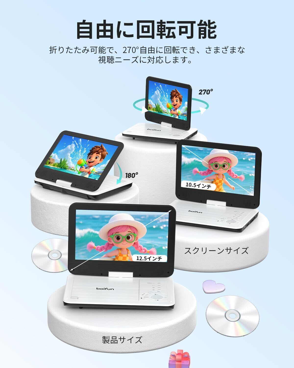 【新着商品】【2025年 超軽量】 BOIFUN ポータブルDVDプレーヤー12.5型 ミニdvdプレーヤー 10.5インチ 1024*600液晶 270°回転可能 折りたたみ式 スクリーン 2500mAhバッテリー 最大5時間再生 CD/DVD/USB/SD/AV対応 旅行 車載 子供向け TV同期可能 リージョンフリー CPRM対応 レジューム機能 リモコン付き 簡単操作