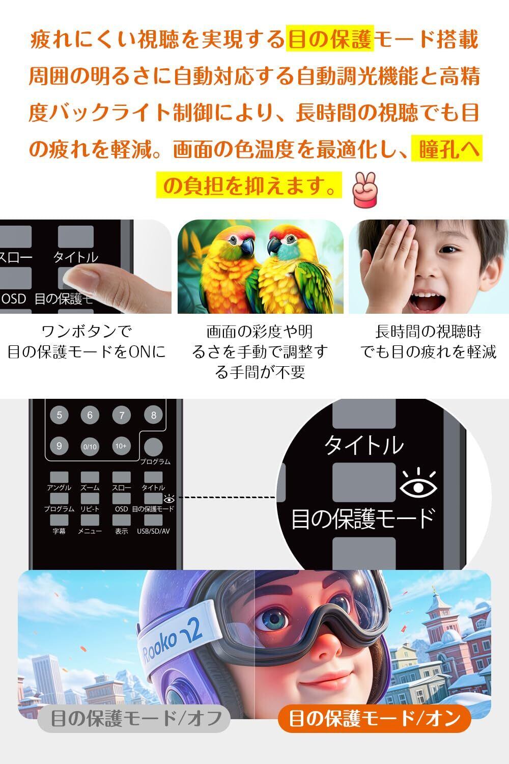 業界独自の「目に優しい視聴モード」搭載 高精細な1024×600 HD液晶パネルを採用。鮮明で臨場感あふれる映像を再生しながらも、軽量・省電力設計を実現しました。さらに、業界が注目する「目保護モード」を搭載。ボタン一つでブルーライトとちらつきを軽減し、暗い環境でも長時間の視聴が疲れにくい画面に切り替わります。お子様の視聴もより安心。一人はもちろん、ご家族との団らん時間を快適にサポートします。