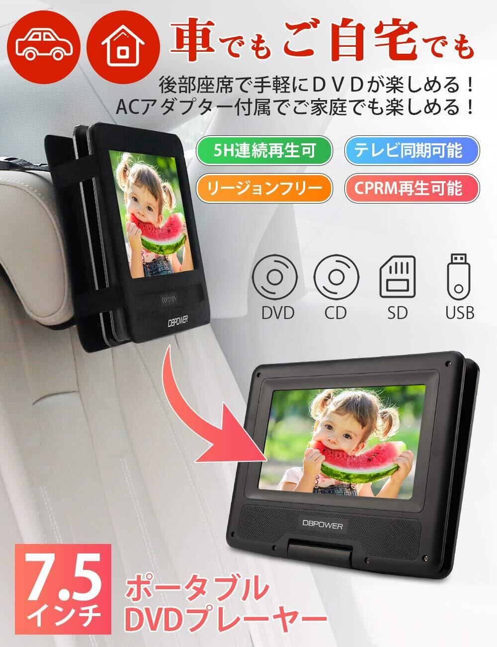 【新着商品】DBPOWER ポータブルDVDプレーヤー 7.5インチ 5時間連続再生 3電源対応 レジューム機能 270度回転 リージョンフリー CPRM対応 TVと同期可能 SD/MS/MMCカード/USBに対応 リモコン付き 日本語説明書付属 (ブラック)