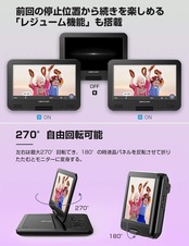 【持ち運びに特化しても嬉しい機能が満載】対応端子あり、USBメモリやSDカードに保存された、画像・映像・音楽が再生できる機種。画面が270度回転可能、細かく微調整ができるのは嬉しい。反転させて折りたたむと載ケースに入れて車の後部座席で鑑賞しやすい。DVDの視聴中に充電が切れても、停止したところを記憶するレジューム機能も搭載。