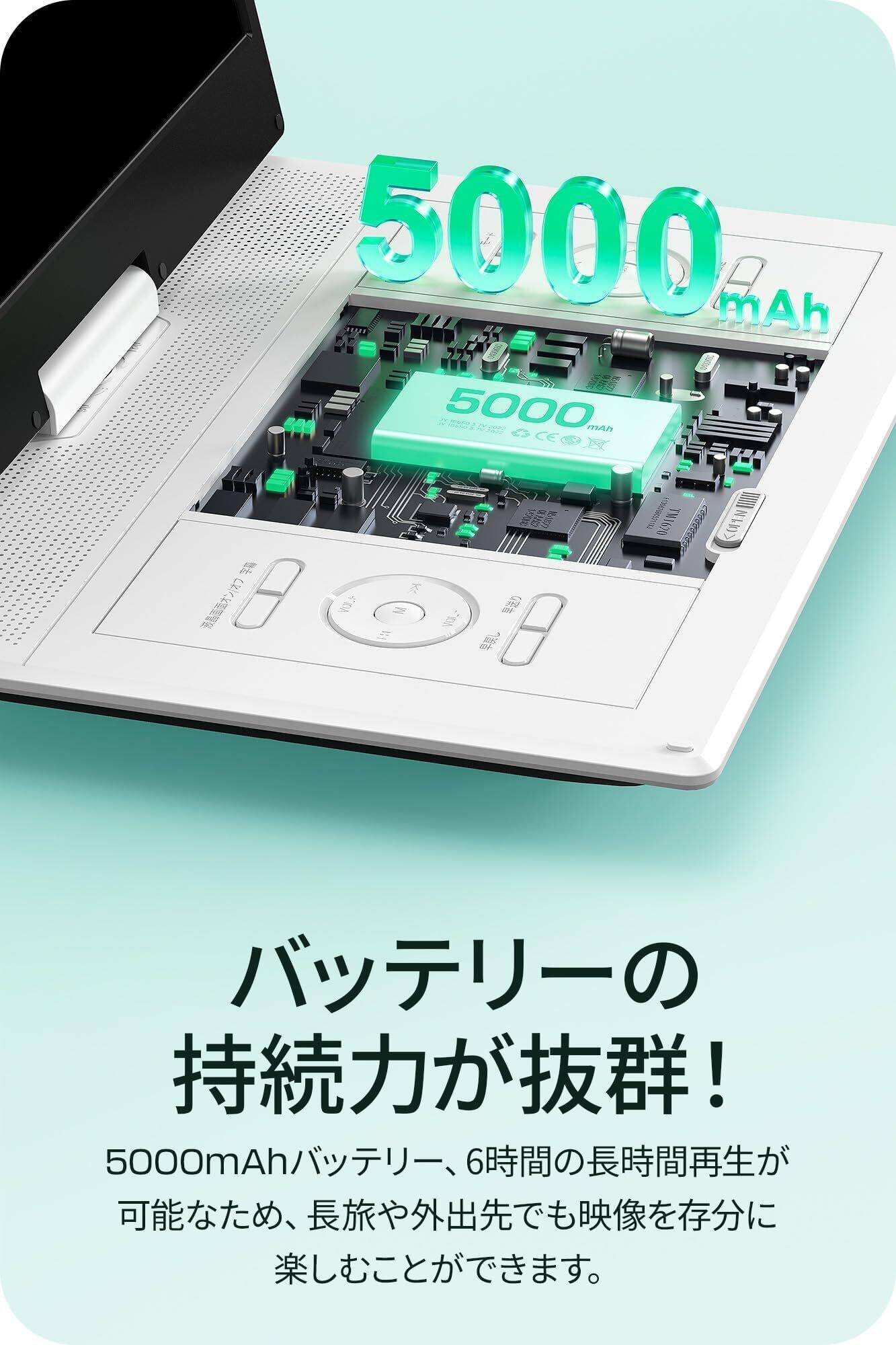 ■【最大6時間の長時間再生が可能!】大容量バッテリーを内蔵し、最大4〜6時間の連続再生が可能です。これにより、長旅やアウトドアシーンでも充電を気にせず、エンターテイメントを楽しみ続けることができます。家庭用AC、車載DC、内蔵バッテリーの3WAY電源に対応しており、シーンに応じて柔軟に使用できる点も魅力です。