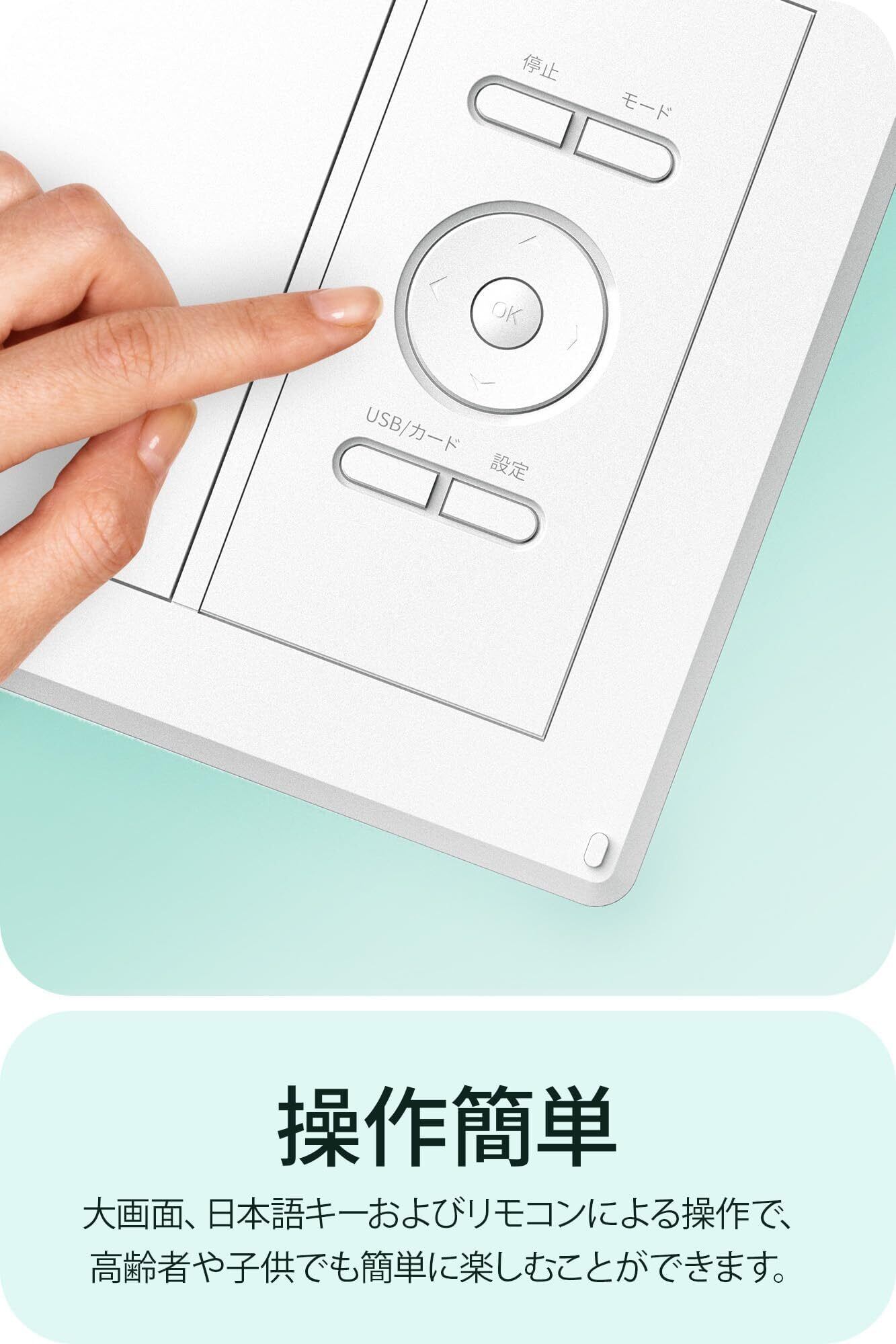 ■【便利な機能満載!】AV出力機能を搭載しており、必要なケーブルを使用するとテレビと同期して大画面での視聴も可能です。また、ラストメモリー機能により、再生中に充電が切れても、直前の再生位置を記憶し、次回はその位置から再開することができます。お子様や高齢者にも使いやすい直感的な操作ボタン設計です。