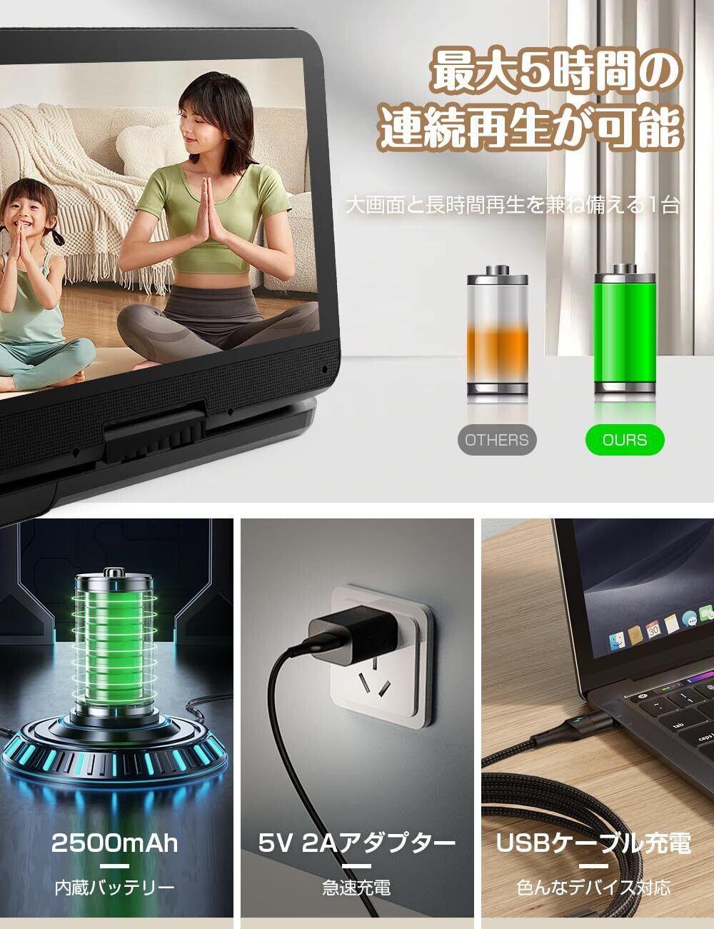 【子どもを連れてのドライブは楽しい】移動中の時間つぶしになり、旅行先や車の中でも映画や音楽が楽しめる優れもの。2500mAhのバッテリー内蔵で、最大5時間再生が可能、長時間続けて見たいときにも安心。家庭用のUSB 5V 2Aアダプター・車載用のUSB充電口・バッテリーと3WAY電源に対応しており、様々なシーンで用途に応じて使いやすいアイテム。