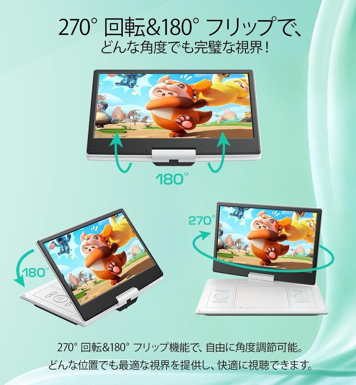 「大画面での快適な視聴を実現」Surfola ポータブルDVDプレーヤーは、14.1インチのHD液晶画面を搭載し、映画やビデオを鮮明に楽しめます。270°回転と180°フリップ機能を備えており、どんな場所でもお好みの角度に調整できます。家庭や外出先で、お子様から大人まで楽しめる最高の視聴体験を提供します。