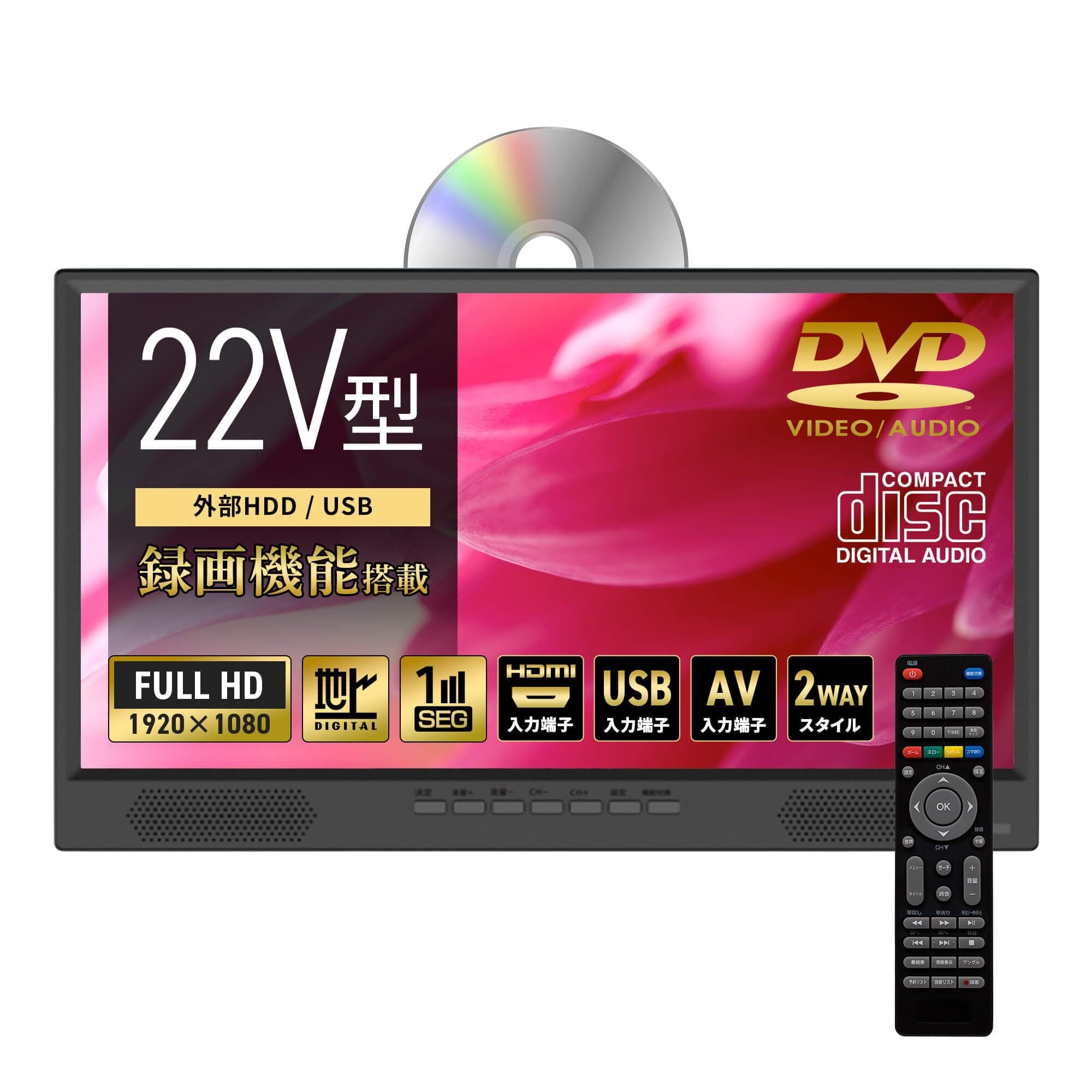[東京Deco] 22V型 フルハイビジョン DVDプレーヤー搭載 ポータブル 液晶テレビ 録画機能 HDMI搭載 LEDバックライト [FHD(1920×1080) / 3電源(AC/車載DC/内蔵電源) / 外付けHDD録画/壁掛け] EPG 液晶 地上デジタル 地デジ フルセグ FHD HDMI USB HDD録画機 16 20 22 24 32 インチ TV 型 o000
