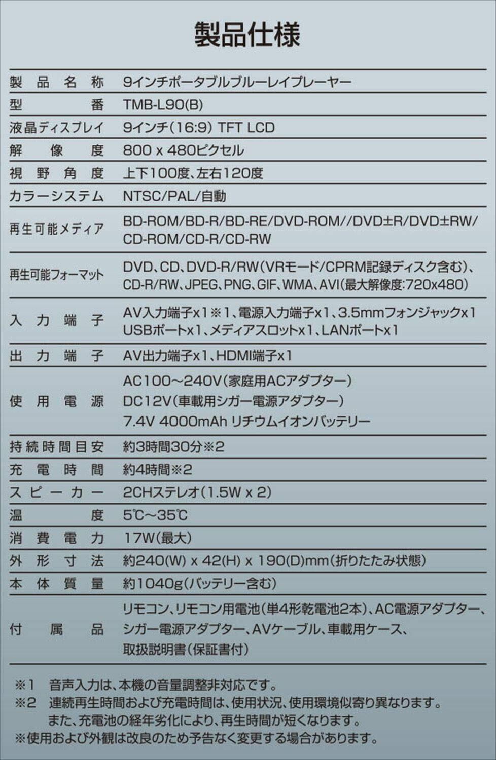 【新着商品】[山善] ポータブル ブルーレイプレーヤー 9インチ CPRM対応 車載用ケース付 TMB-L90(B) [メーカー1年]