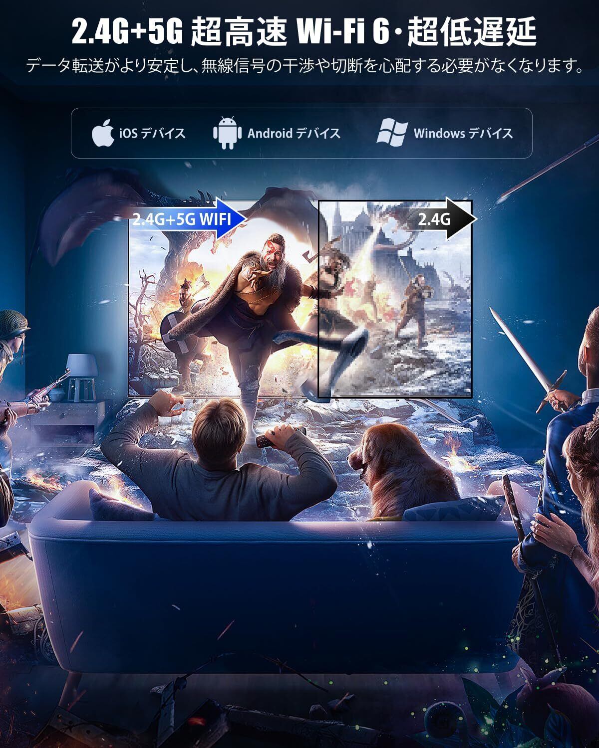 【超高速Wi-Fi 6・Bluetooth5.4・高音質HiFiスピーカー】ミニ天井プロジェクターは、独自の高精度チップ技術を採用し、超高速Wi-Fi 6接続を搭載していますので、2.4Gと5Gの両方の帯域に対応し、安定した信号と高速伝送を実現します。iOS、Android、Windowsデバイス(ミラーリング対応のスマートフォン、タブレット、デスクトップパソコンを含む)にWi-Fi経由で素早く接続し、スムーズで遅延のないオンラインゲーム、映画鑑賞、ビデオストリーミングを簡単にお楽しみいただけます。また、Bluetooth 5.4と高品質HiFiスピーカーを内蔵し、お気に入りのBluetoothスピーカーやヘッドホンからオーディオを再生することで、真に没入感のある3Dサウンド体験をお楽しみいただけます。