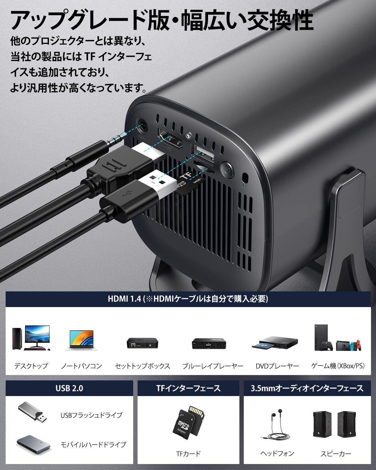 【幅広い互換性・TFインターフェース追加】無線でも有線でも接続できる家庭用プロジェクターは、Wi-Fiに接続すると、内蔵アプリを使って直接視聴できるだけでなく、スマートフォンやiPadにミラー投影して視聴することもできます。さらに、この小型プロジェクターはHDMI1.4、USB2.0、TF、3.5mmオーディオポートも搭載しており、有線接続もできます。デスクトップパソコン、ノートパソコン、セットトップボックス、ブルーレイプレーヤー、DVDプレーヤー、ゲーム機、USBメモリ、モバイルハードディスク、TFカード、スピーカー、有線ヘッドホンなど、様々な機器と互換性があります。