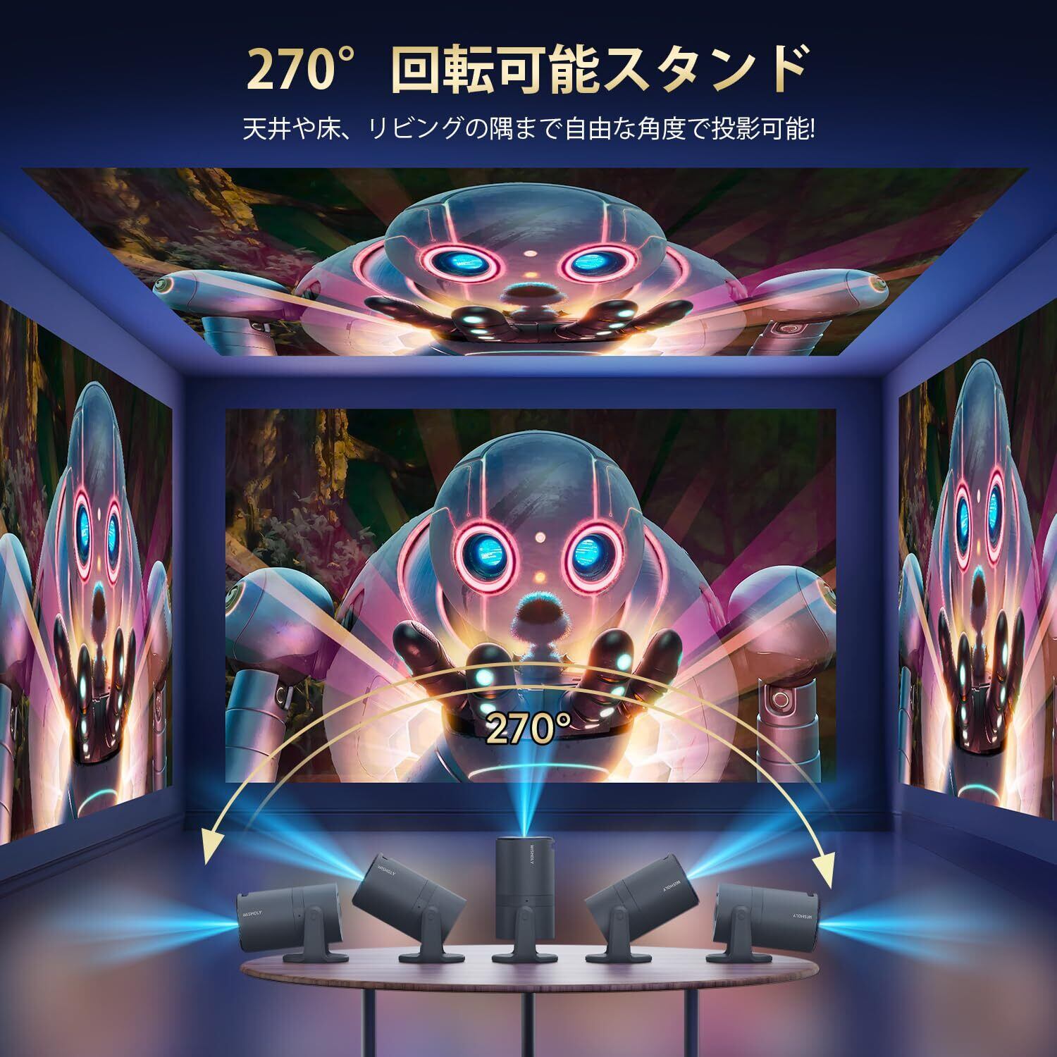 ■【270°回転スタンドと自動台形補正で手軽に設置!】270°回転可能なスタンドを採用し、あらゆる角度での投影が可能です。自動台形補正機能により、設置時の傾きを瞬時に補正し、理想的な映像を簡単に楽しめます。どこでも手軽に設置できるので、家でもアウトドアでも活躍します!