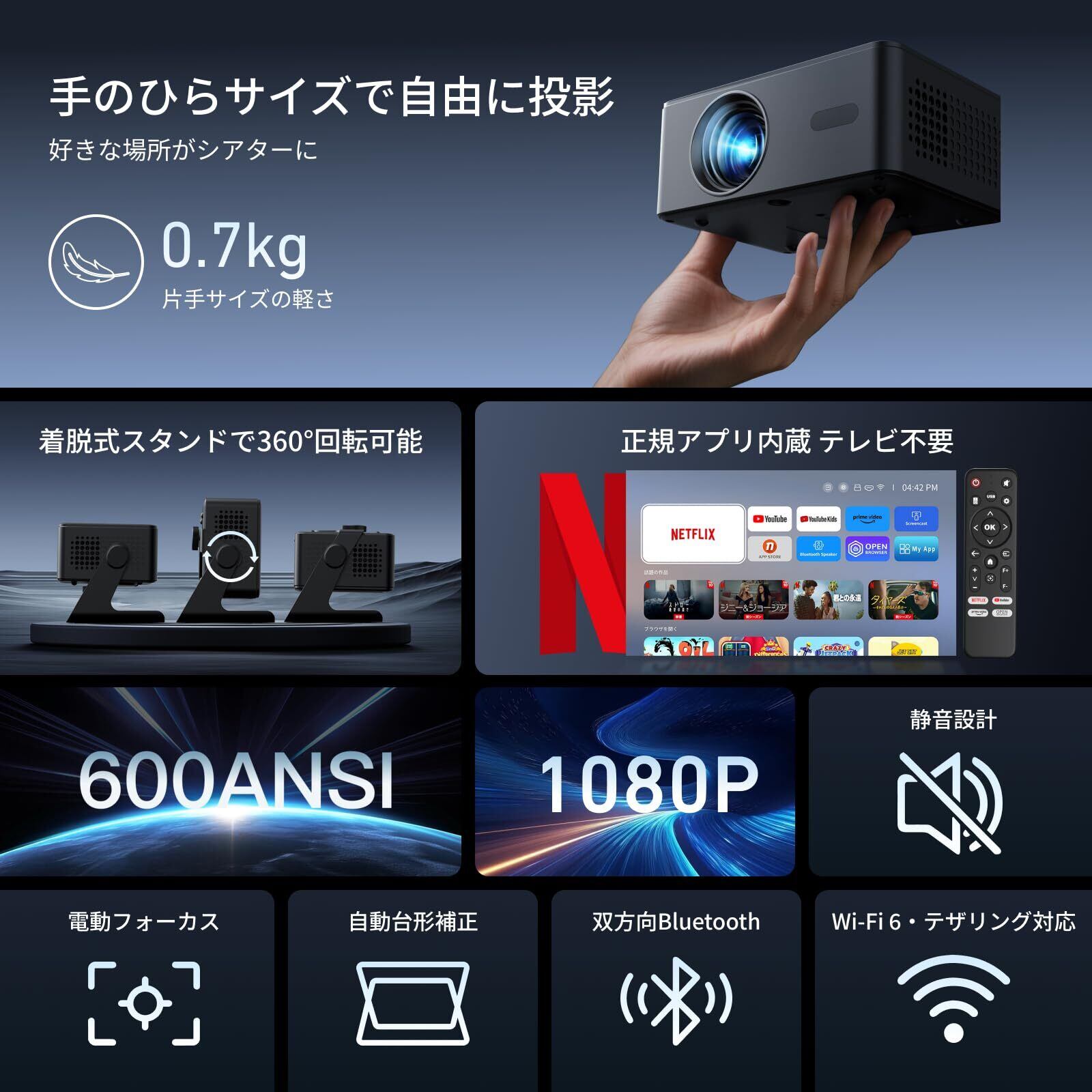 【新着商品】プロジェクター家庭用 小型 天井 静音【Netflix・Prime Video・YouTubeアプリ搭載】600ANSI 4K対応 自動台形補正 0.5M短距離投影 Wi-Fi6/Bluetooth5.4スタンド一体型 軽量 ミニ スマホ/パソコン/PS5/Switch/DVD接続可 プレゼント3年2025年新登場MX1ブラック