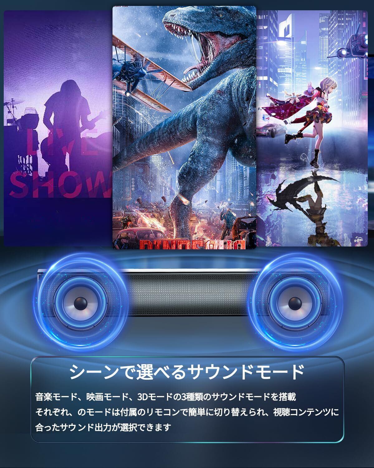 【3つのサウンドモード·臨場感あふれるサウンド】 シーンに合わせてカスタマイズ可能な3つのサウンドモード。映画モードでは迫力の重低音、音モードではクリアな音質、3Dモードでは明瞭な会話が楽しめます。付属のリモコンで簡単に切り替え可能で、臨場感あふれるサラウンドサウンドをお好みに合わせてお楽しみいただけます。DSPテクノロジーにより、卓越したクリアでリアルな音質が提供され、音楽や映画を楽しむたびに、まるでその場にいるかのような感覚を体験できます。音楽の微細なニュアンスまで美しく再現し、臨場感あふれるエンターテインメント体験をお届けします。