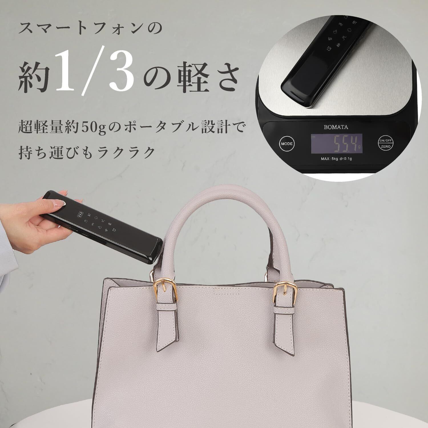【自宅でも外出先でも】約50gの超軽量設計のため持ち運びもラクラク。オフィスでの休憩中、旅行先、出張先など、ご自宅以外の幅広いシチュエーションでご使用いただけます。