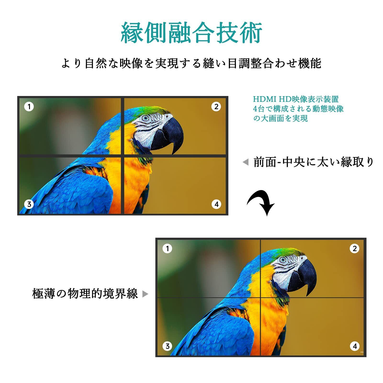 大画面接続:HDMI1入力4出力に対応したビデオウォールコントローラー 2x2です。主な機能は、完全なHDMI HD画像信号を4つに分割し、リアプロジェクションユニット、LCDテレビなどの4つのビデオ画面に分配することです。HDMI HDビデオディスプレイ4台で構成される大型動画画面を構成しています。