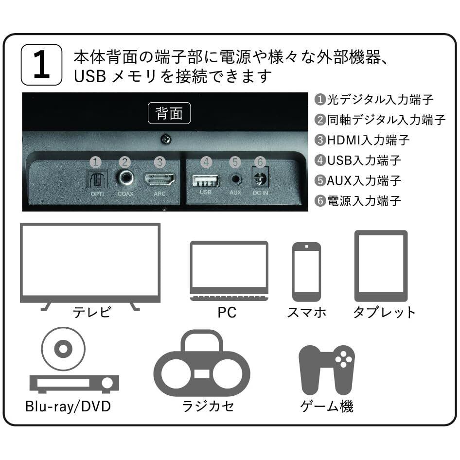 入力端子:AUX、OPTICAL、HDMI(ARC対応)、COAXIAL 外部入力:USBメモリ