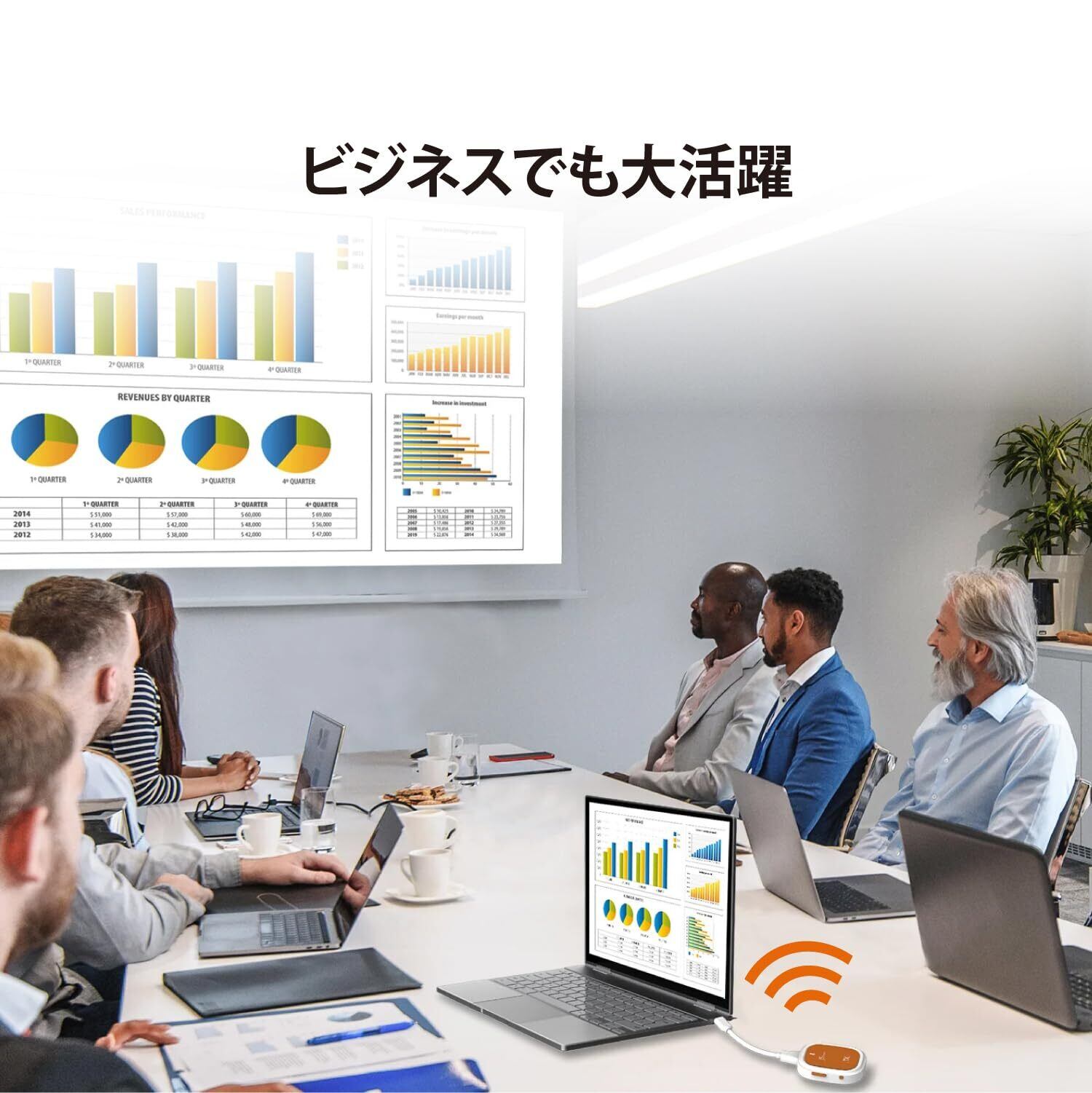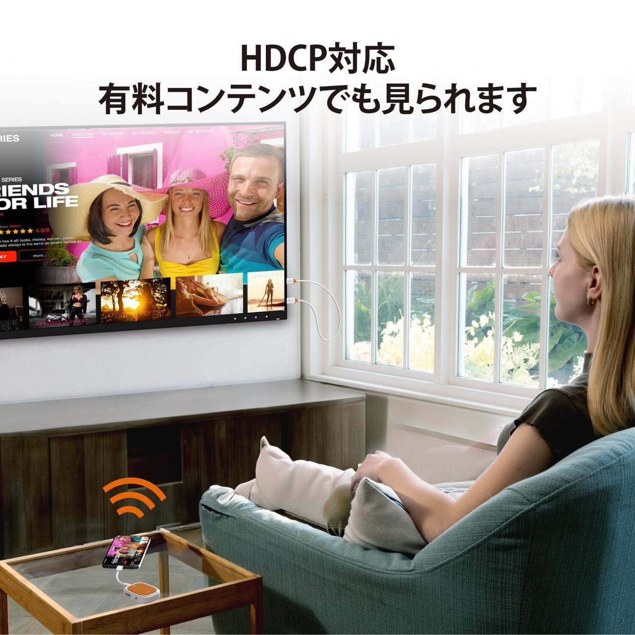 【HDCP対応】HDCP1.4に対応しているので、Netflix、 Prime Video、Huluなど 著作権保護されたコンテンツを見ることができます。※ご使用の送信デバイスと受信ディスプレイもHDCPに対応している必要があります。ノートPCや端末の画面をワイヤレスでテレビに映して、有料コンテンツも大画面で楽します。設定不要、接続するだけでモニター投影が可能な為、会議室等でパソコンからワイヤレスでミラーリングしてプレゼンテーション可能です。 ※各種動画サービスは個別に契約が必要です。