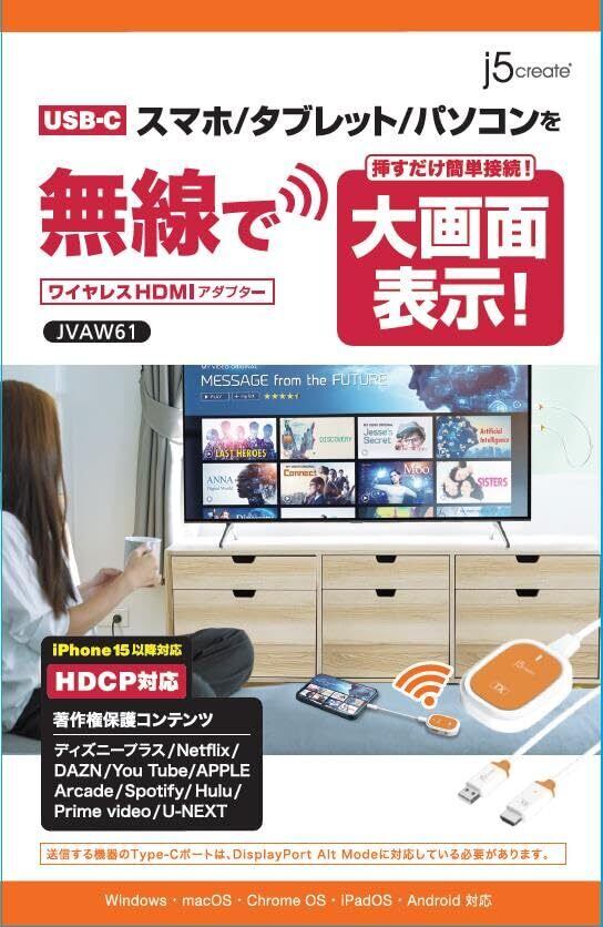 j5create ワイヤレス USB C to HDMI 送受信機セット HDCP対応 無線距離30m 5GHz プラグ&プレイ 設定不要 1080p 有料コンテンツ視聴可能 大画面ミラーリング 複製モード 拡張モード対応 会議室/教室/自宅 USB Cスマートフォン/テレビ/PC/Mac/Windows 対応 JVAW61-EJ