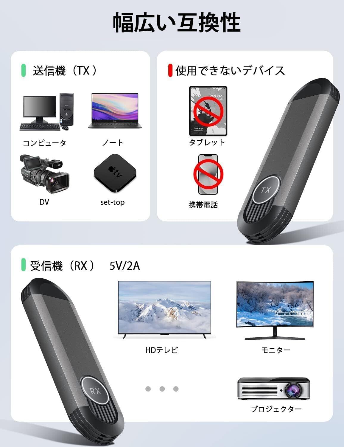 【幅広い互換性】:本製品の無線HDMI送受信機セットは、PC、タブレット、Mac、スマートフォン、テレビボックス、カメラから、プロジェクターとモニターなどへ、高画質な映画、テレビ番組、ビデオ、プレゼンテーションをワイヤレスに伝送することができます。会議室のミーティング、家庭シアター、ホームエンターテイメント、プレゼン、マルチメディア教育用途などにも最適です。