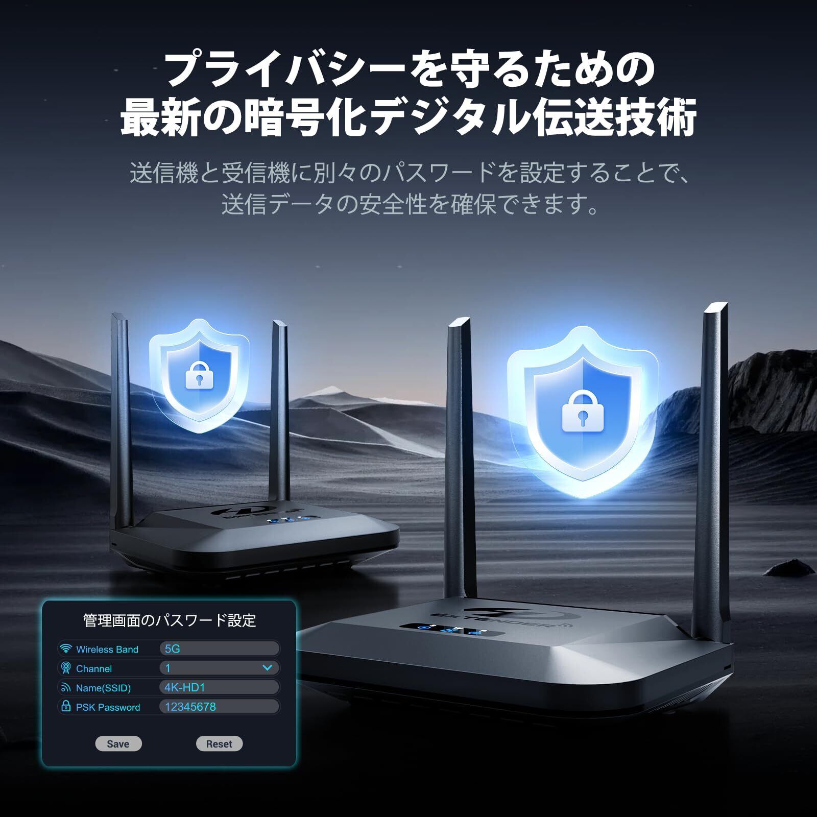 【新着商品】ワイヤレスHDMI 無線送受信機、プライバシー暗号化対応、4K/30Hz解像度デコード&伝送対応【2025年モデル】、最大300メートル伝送、HDMIループアウト、IRリモート拡張、デュアル冷却システム、9チャンネル周波数切替、1TX→3RX接続対応