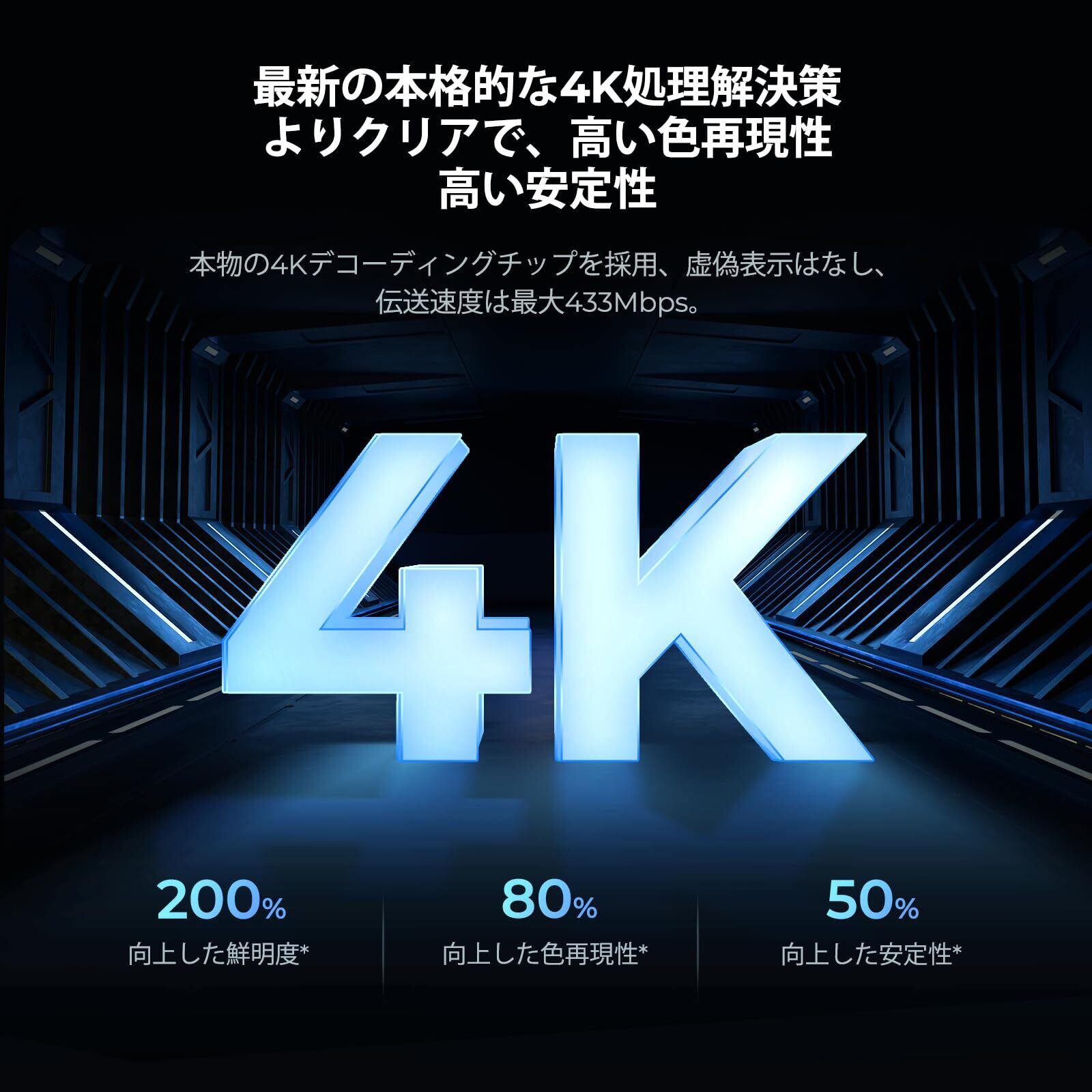 真の 4K パワーを発揮: Graige 952 のハードウェア デコードは、1080P デバイスの 4.4 倍のコンピューティング パワーを提供し、優れた 4K 30HZ 伝送を実現します。1080P 60HZ ストリーミングでは、低遅延がされ、シームレスでラグのないエクスペリエンスが実現します。