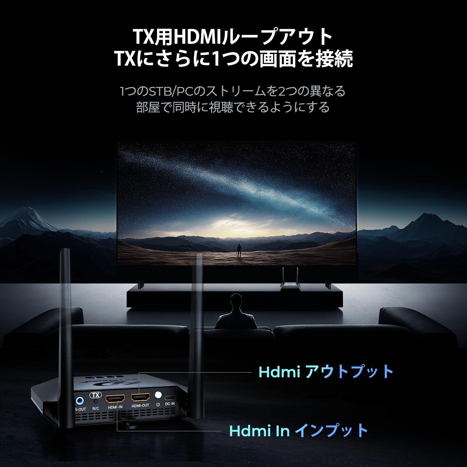 デュアル ディスプレイ用の HDMI ループアウト: Graige 952 ワイヤレス HDMI トランスミッターには、追加の HDMI 出力ポートが含まれています。1 台の STB/PC のストリームを 2 つの異なる部屋で同時に表示できます。